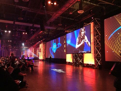 扉を抜けると、ため息が思わずこぼれる。 サッカーコートが3面くらいとれるほどの大きい会場がそこに広がっていた。 無数の椅子が整然とならび、そこを足早に参加者が自分の席をもとめて進んでいく。 5台の巨大ビジョンにはre:Inventのロゴ、2台の中型ビジョ…