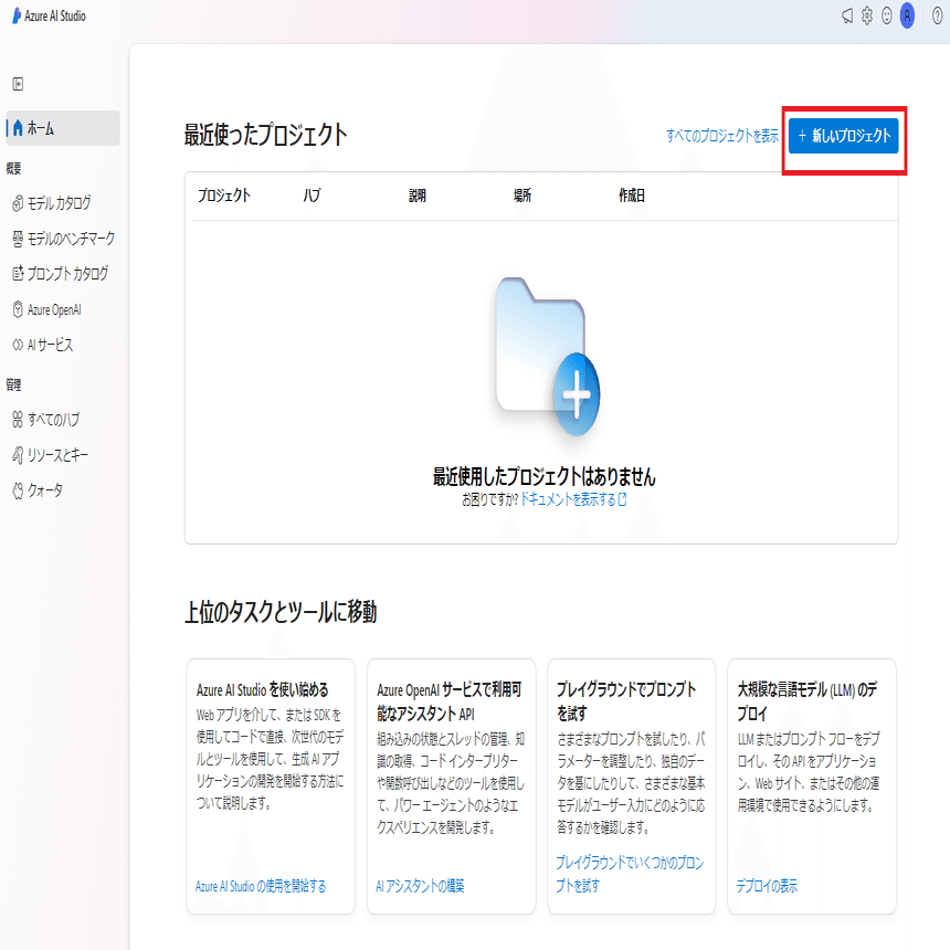 最初の説明で「AIモデルを構築し、デプロイする」と書いた通り、この時点では単にハブとプロジェクトが作成されただけであって、GPT-3等のAIモデルがデプロイされていないため、このままでは何もできません。