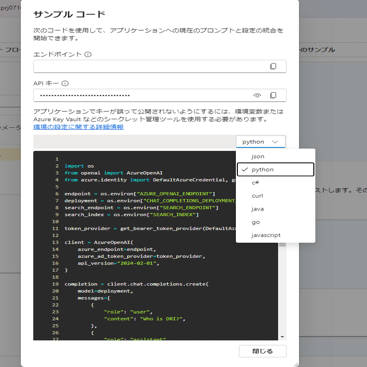 (言わずもがなかもしれませんが、「エンドポイント」「APIキー」の右側のアイコンをクリックするとクリップボードにコピーされます)