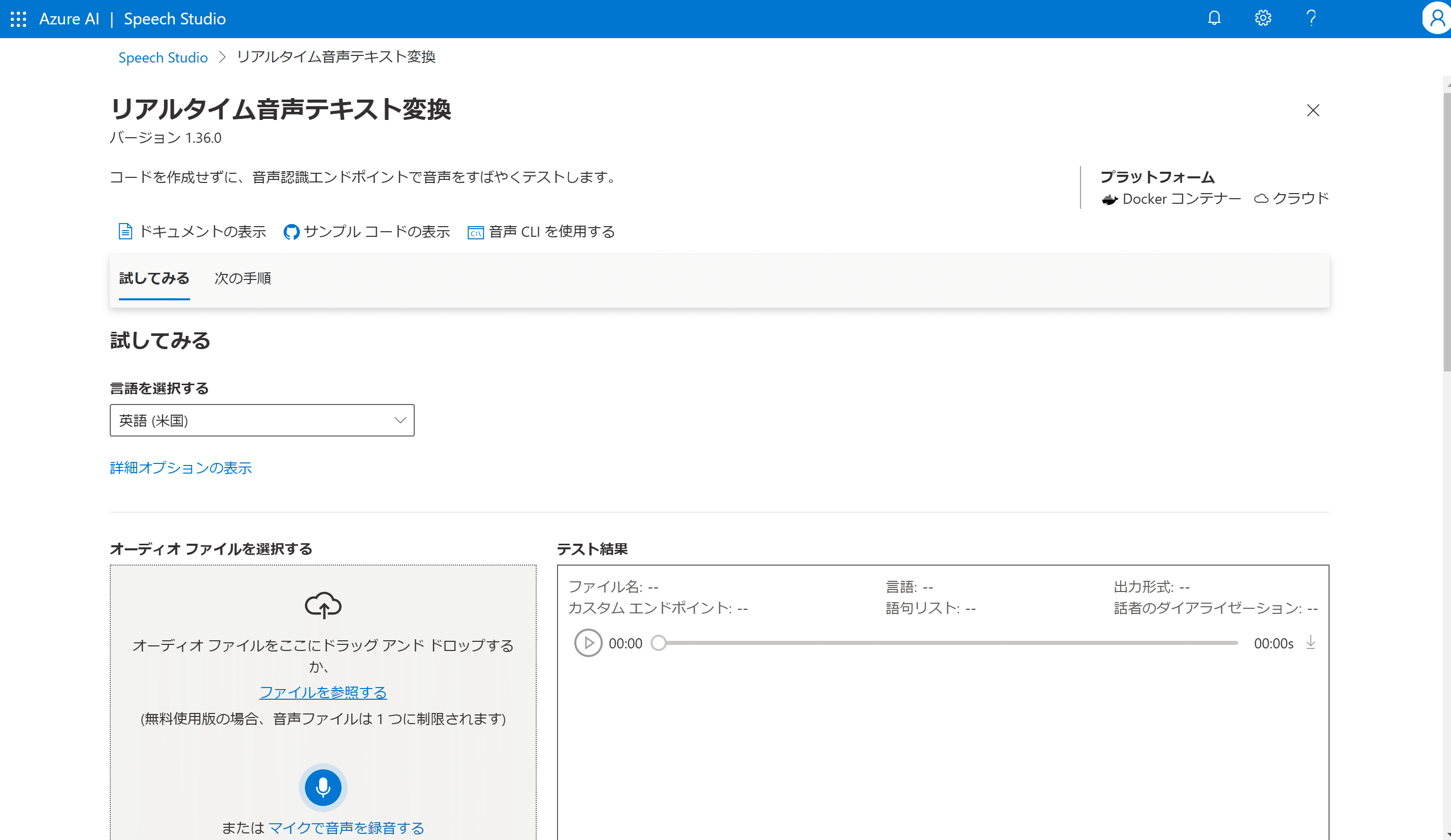 今回は上の4つの機能のうち、「音声テキスト変換」の「リアルタイム音声テキスト変換」を試してみたいと思います。