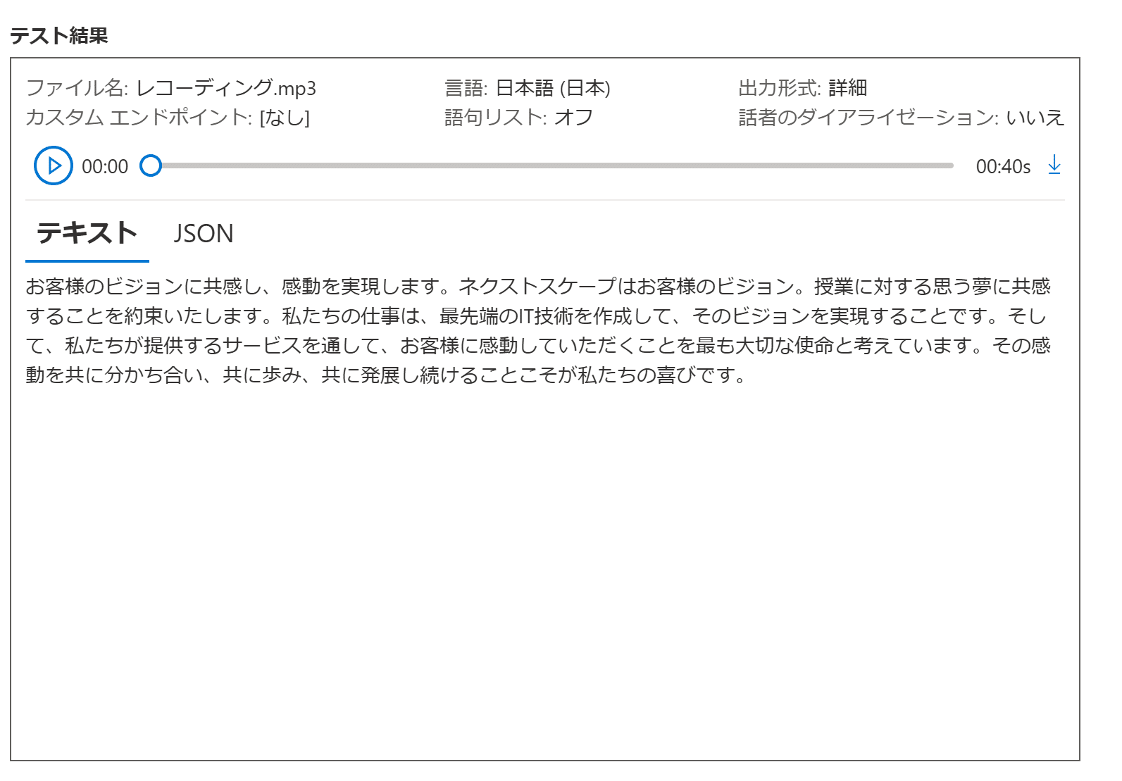 そしてその録音したファイルをアップすると即変換が行われまして、結果は以下のようになります。