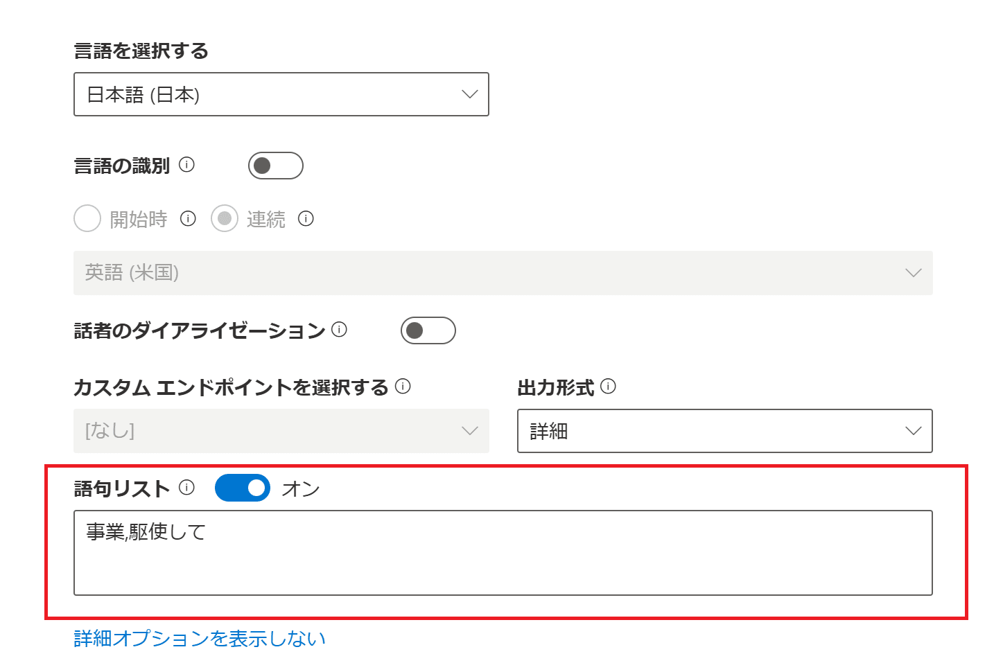 ヘルプによると語句のリストを指定することで音声認識の精度を向上させることができるようです。