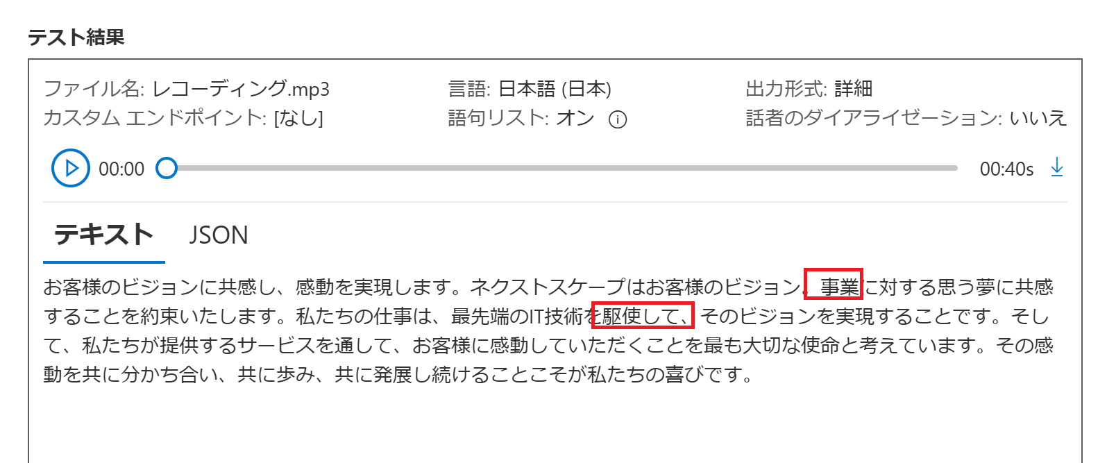 語句リストを登録後、再度文字起こしを試した結果が以下になります。