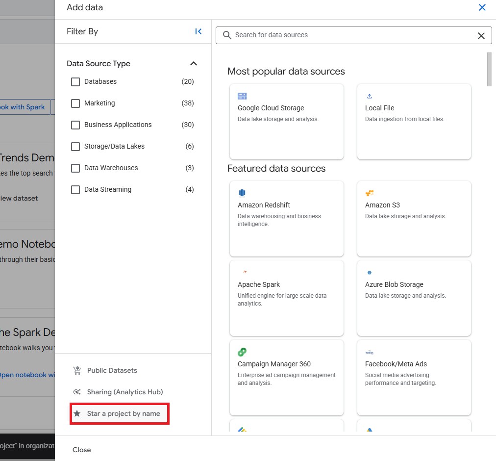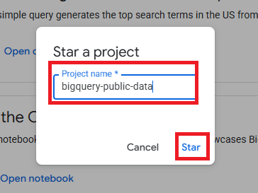 そして赤枠の「Star a project by name」をクリックし、以下のダイアログが表示されるので「bigquery-public-data」と入力して「Star」をクリックします。