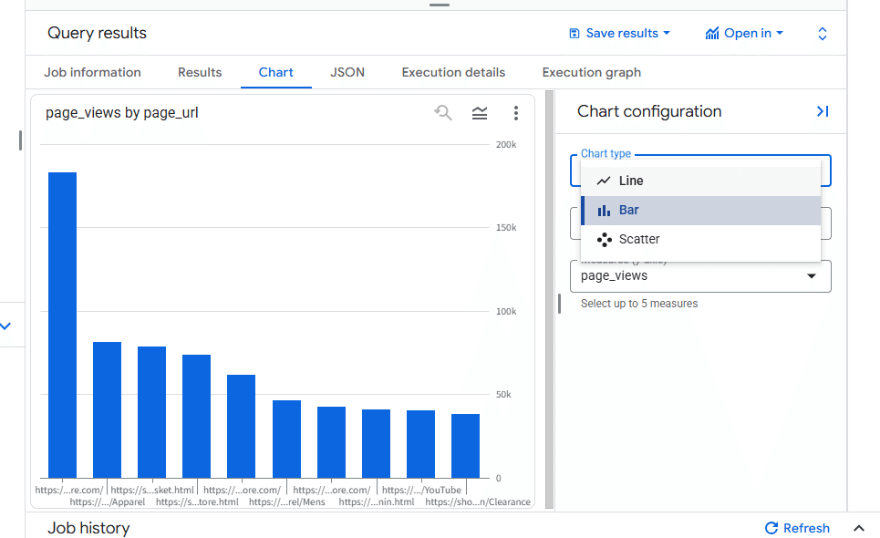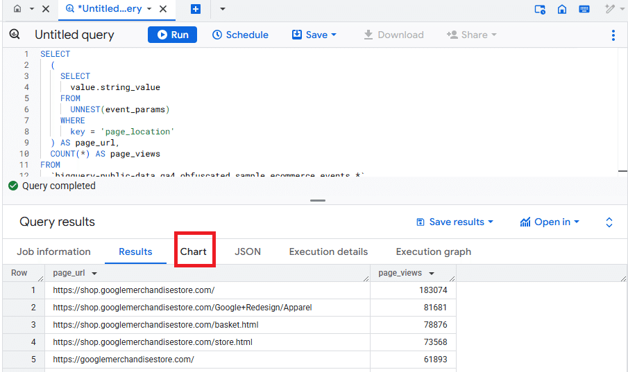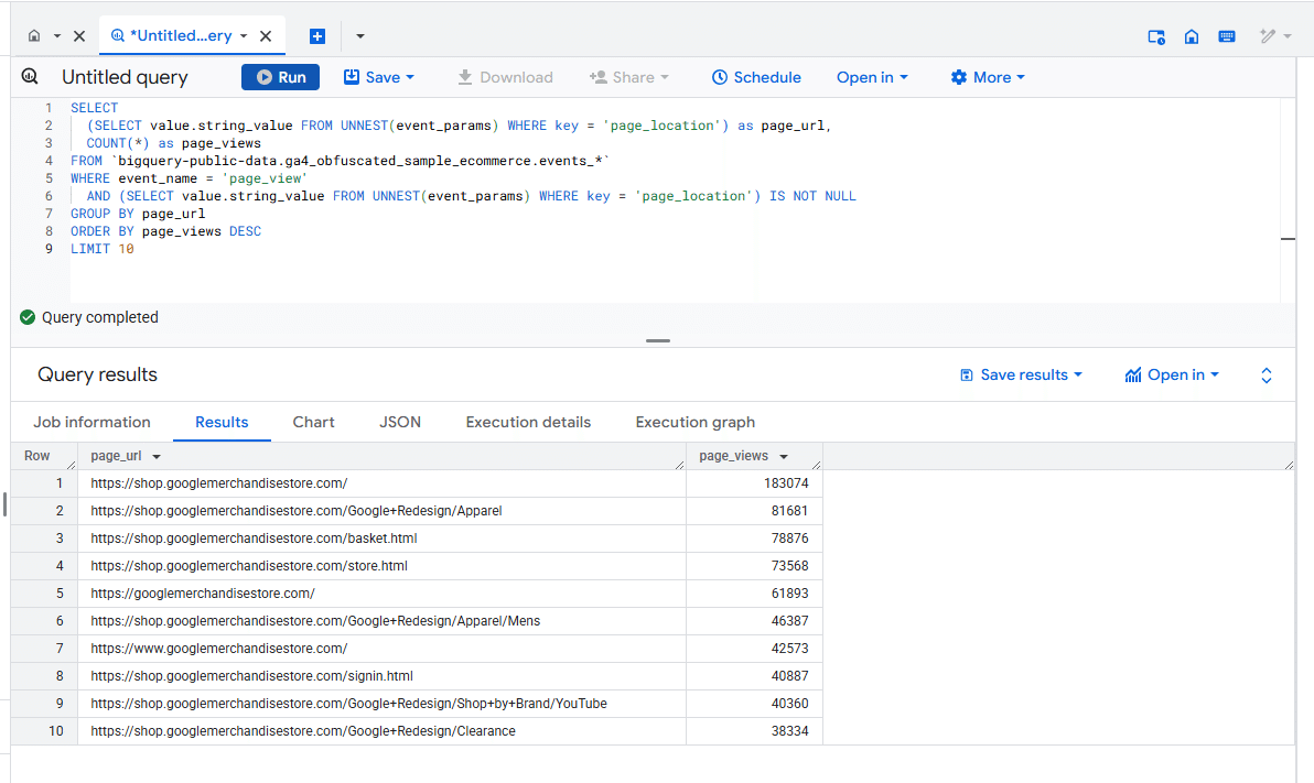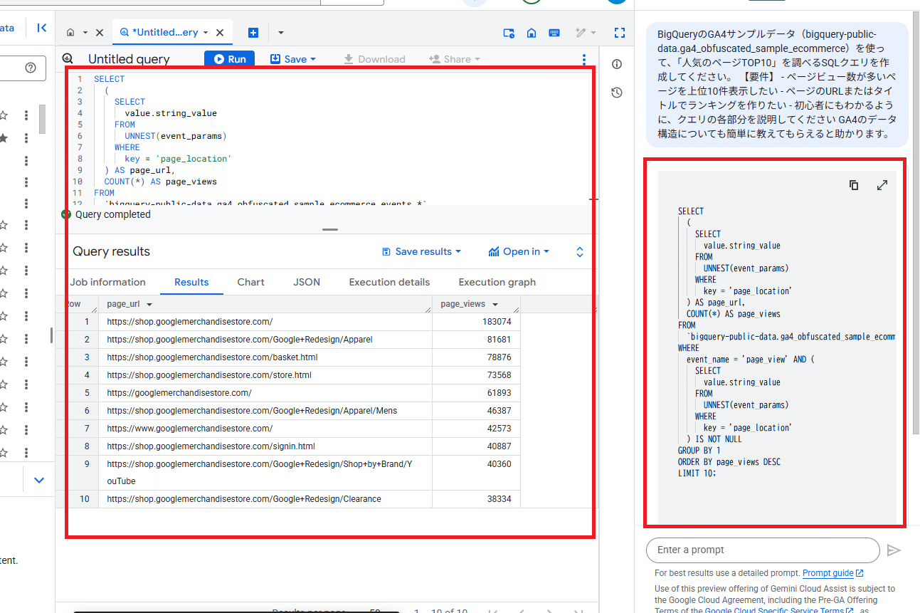 左側赤枠部分でクエリを実行できますのでそこで今回の出力されたクエリを試してみると、要望通りPV数をTOP10を抽出できました。