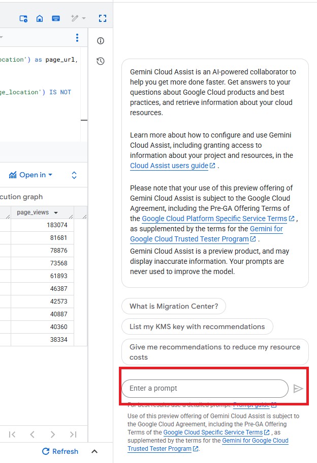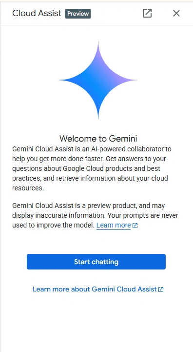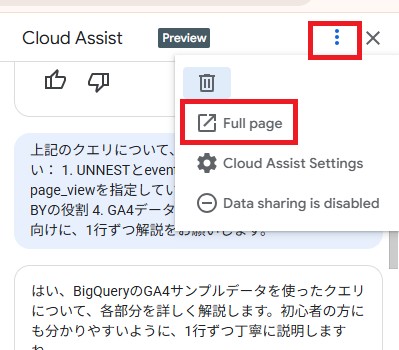 まずは画面右側のCloud AssistでGeminiとのチャットを開始します。
