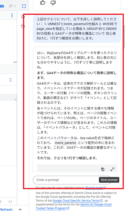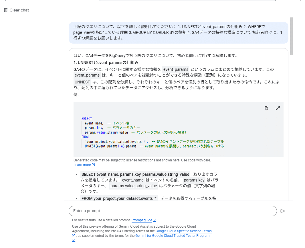 Cloud Assistは基本的にSQLの記述支援になりますので基本的にはSQLの提示のみになるのですが、プロンプトの書き方を工夫することでクエリ自体の説明はもちろん、以下のように今回対象としているGA4のデータ構造についても教えてくれます。