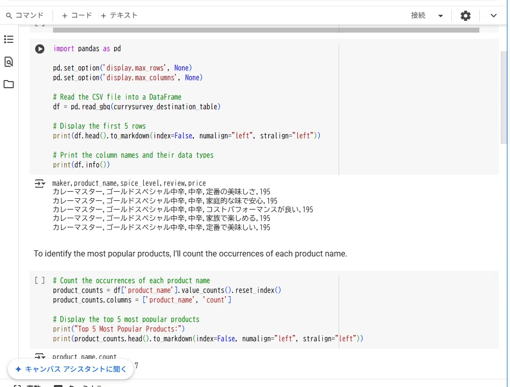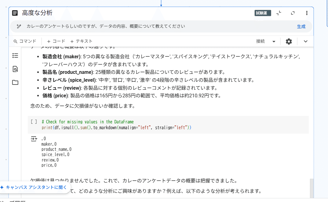 このようにデータキャンバスは簡単なプロンプトにもかかわらず、色々と配慮した形で情報を出力してくれます。