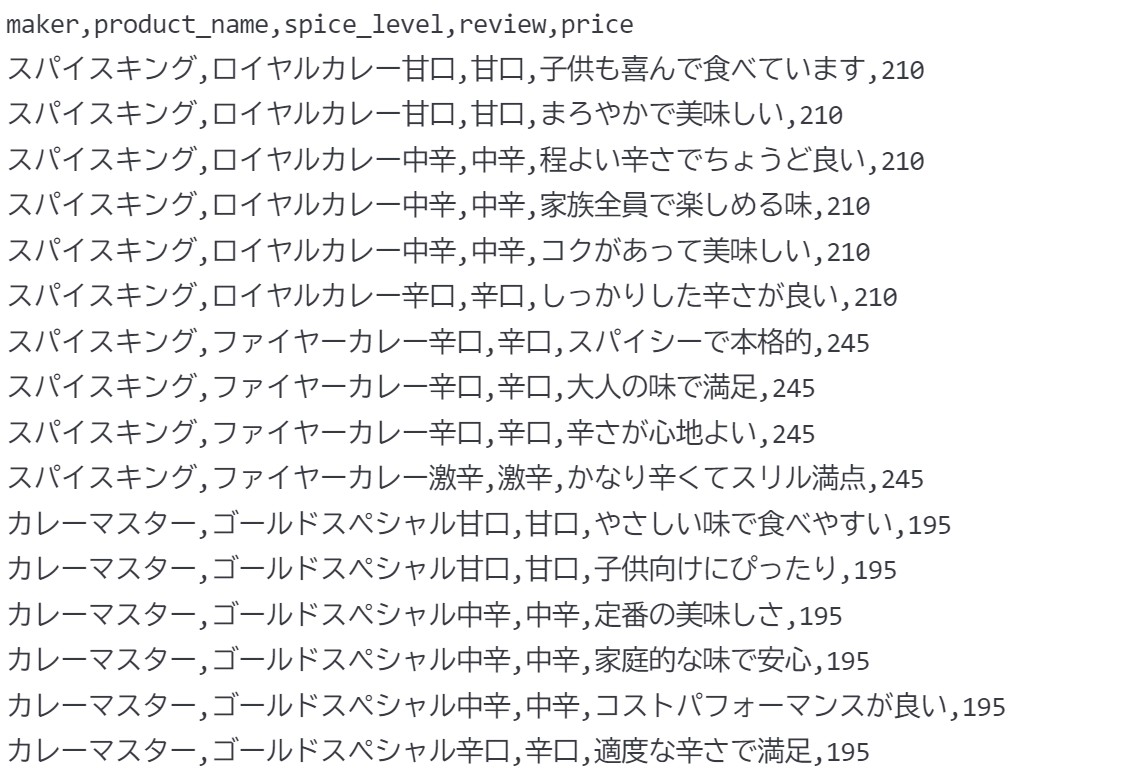 そこで、仮想の(カレーに特化した)食品メーカーとレトルトカレーの製品に関するアンケート結果のデータを作ってみます。辛さとレビュー、値段(今回は定価とします)も加えます。