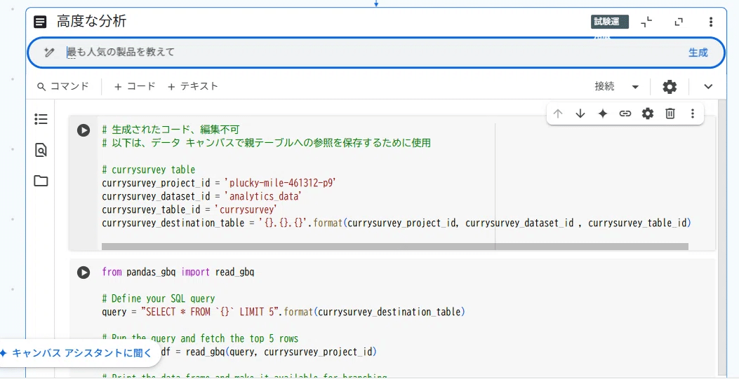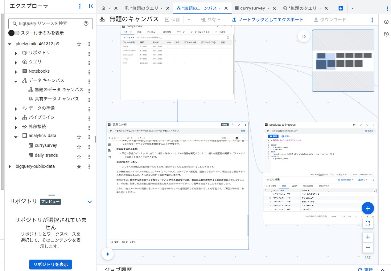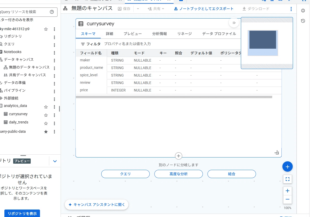 このデータ(currysurverという名前にしています)をBigQueryに追加し、「データキャンバス」という機能で取り込みます。