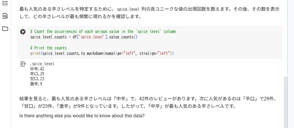 「結果を日本語で説明してください。どの辛さレベルが最も人気ですか?」と聞いてみます。