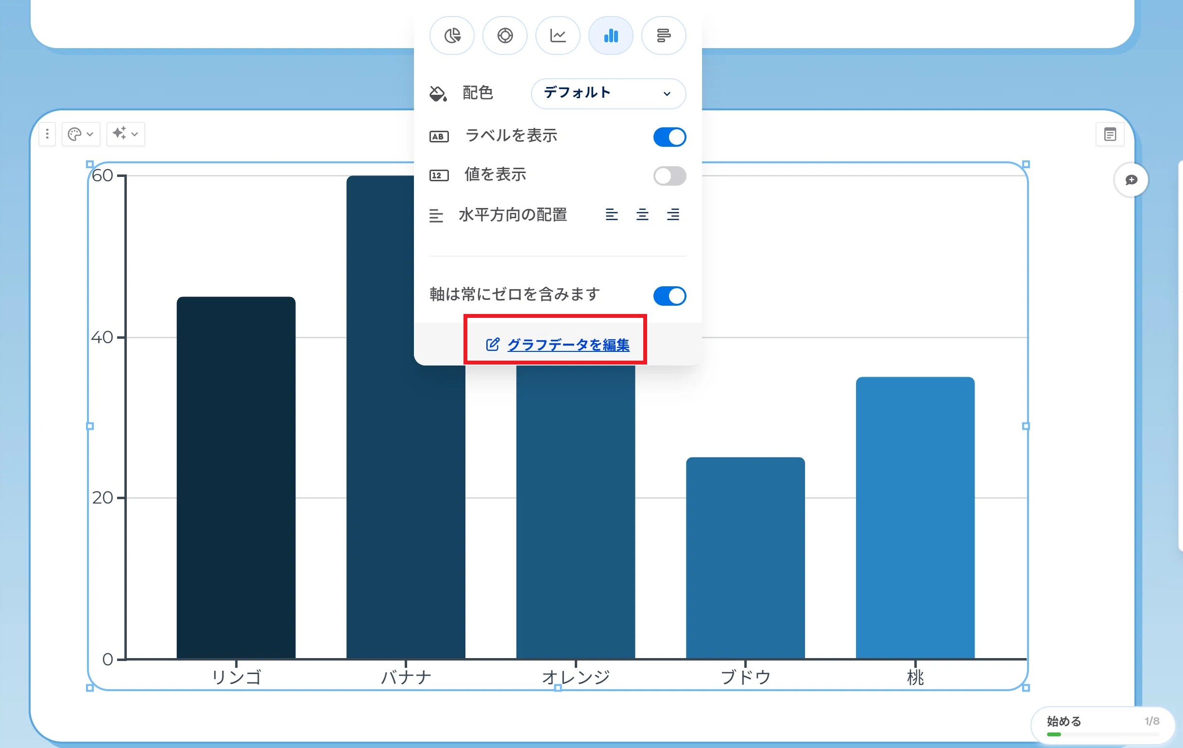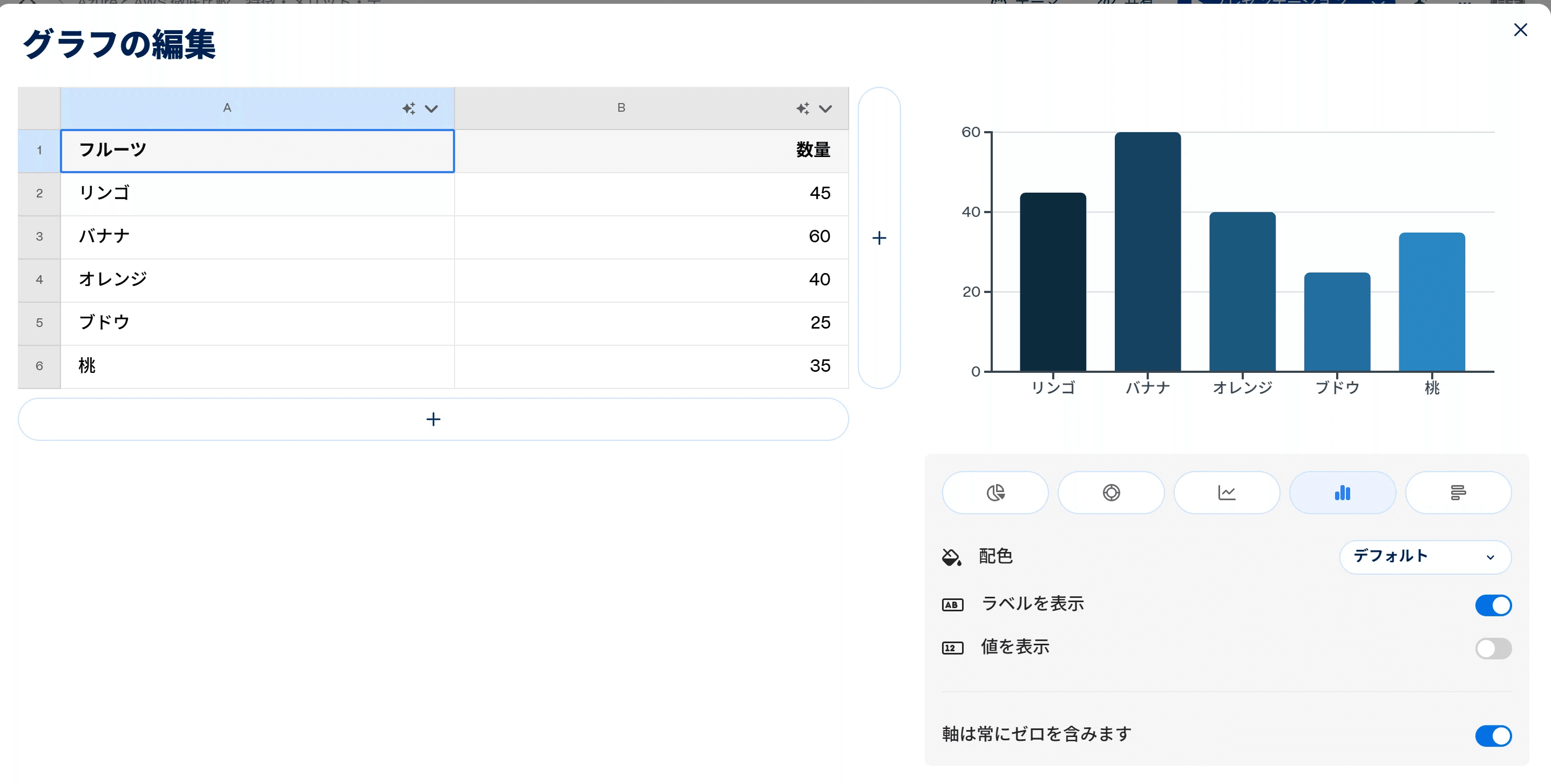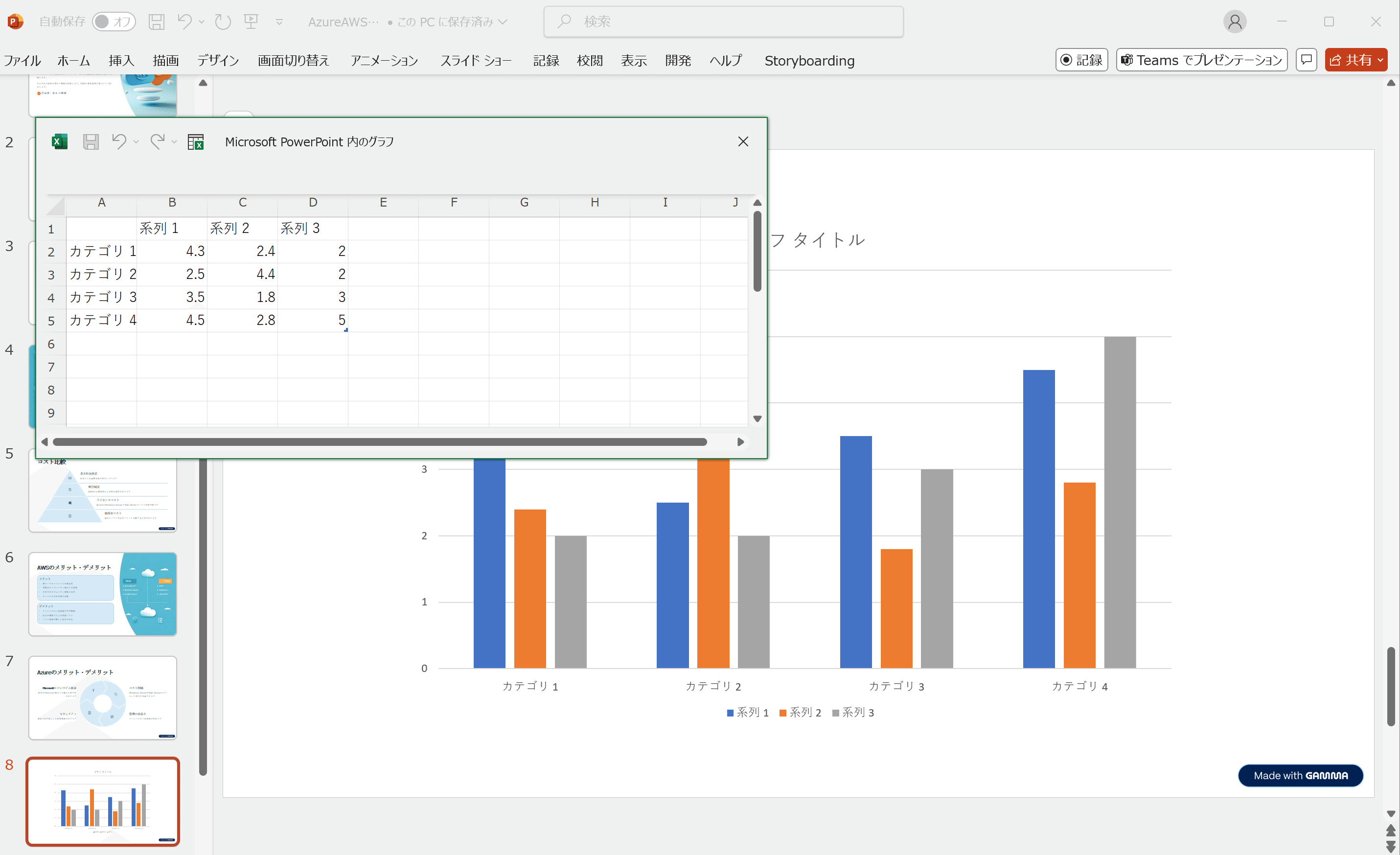 このようにグラフが表示され、更にグラフを選択して表示されたメニューから「グラフデータを編集」を選択すると
