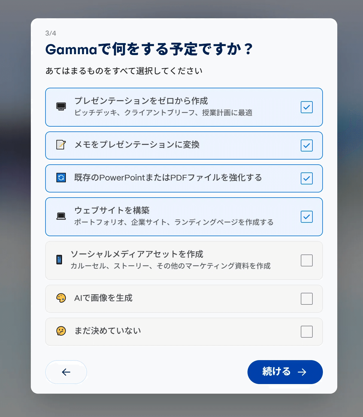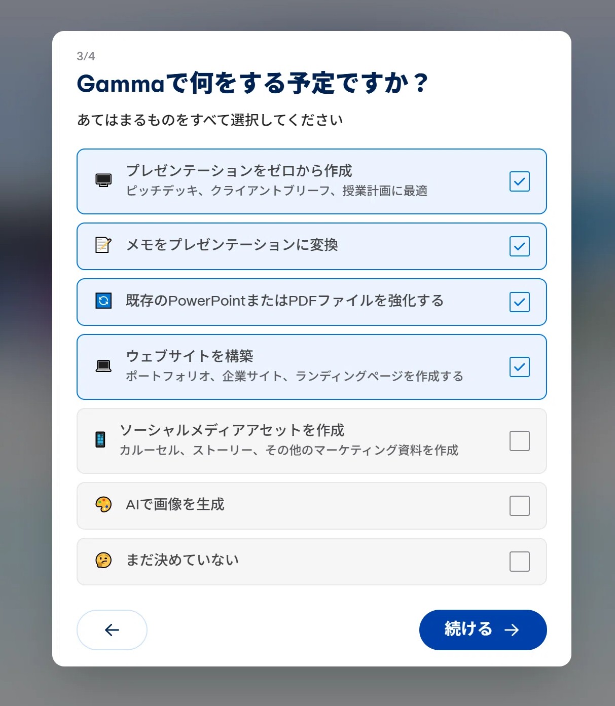 以下のようなアンケートがありますが、「まだ決めてない」という項目もあるので、その後の操作には影響しないようです。