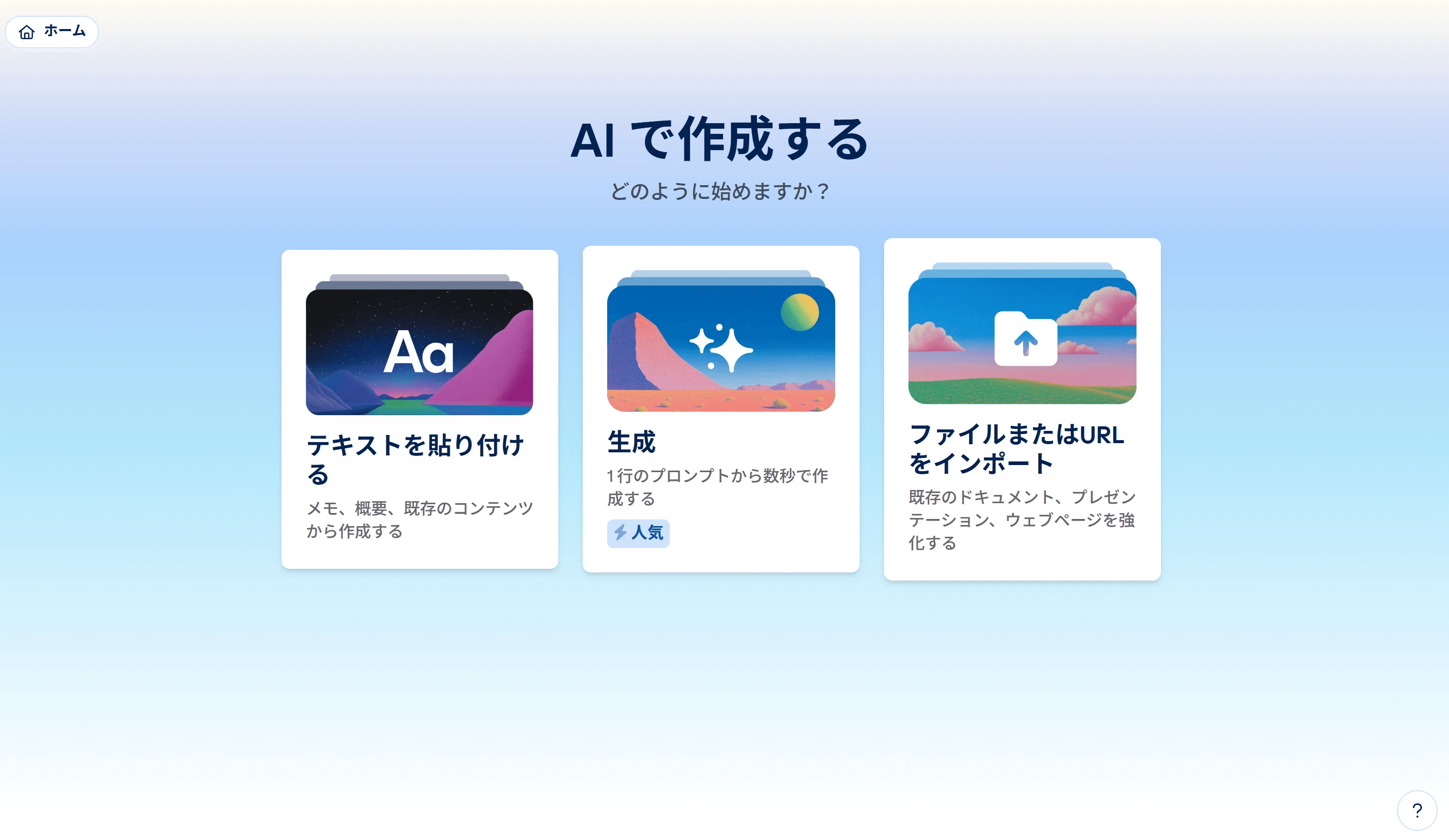 サインアップが終了すると以下の画面になります。何を元に作成するかの選択画面になります。以前、PowerPointでCopilotを試したときも簡単な文章から作成してもらいましたので比較の意味も含め「生成」を選択します。