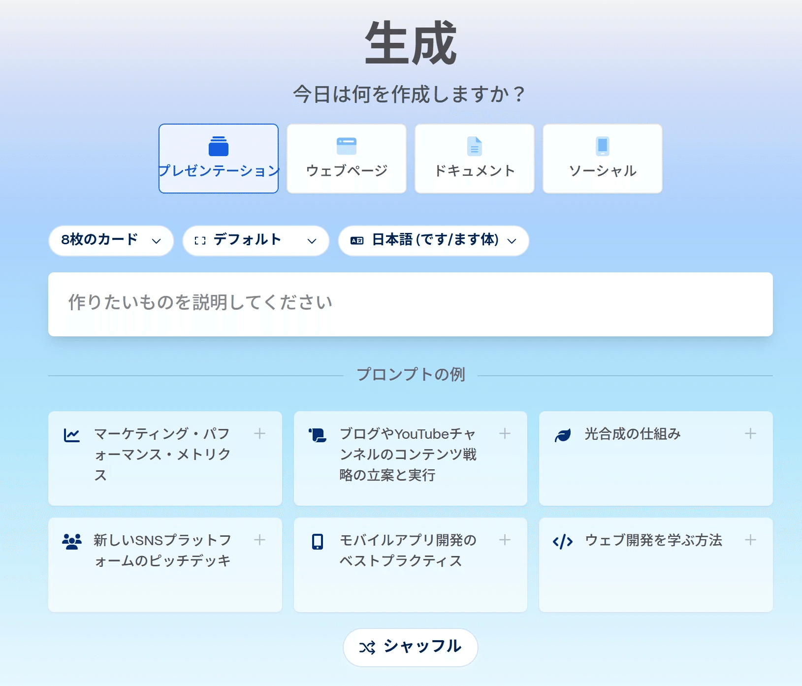 「作りたいものを説明してください」と書かれた入力欄に以下の内容を入力してみたいと思いますが、