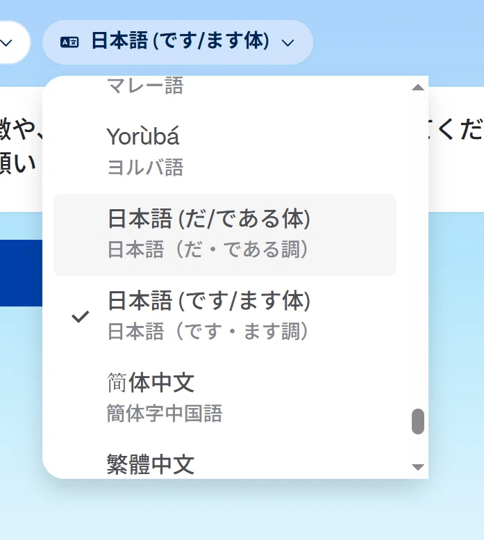その前に画面上の設定で皆さんも気になっているであろう部分があると思うのでそちらを説明しておきますと、「日本語(です/ます体)」をクリックすると言語が選べます。日本語も「だ/である体」と先ほどの「です/ます体」を選べるのは非常に配慮が細かくてよいなと思いました。自分で書くと統一し忘れていることもありますので。