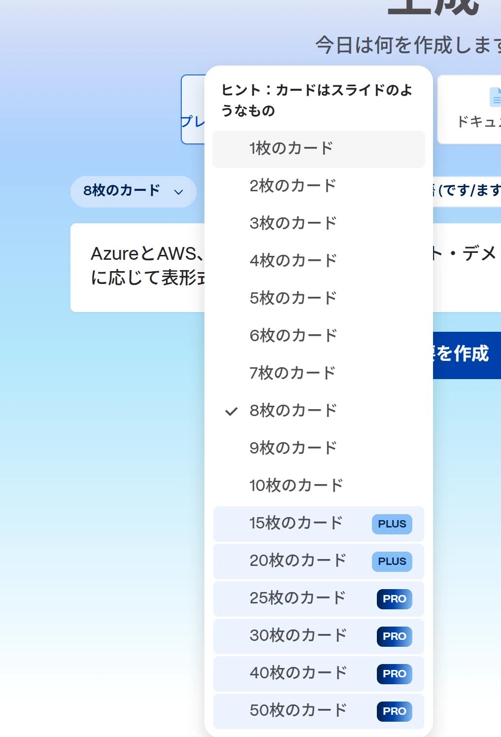 あとは「8枚のカード」と表示されている箇所、こちらは以下の画面の通り「カード」=「スライドもしくはページ」でして、今回の依頼内容を「何枚で」表現するかもここで指定できます。「PLUS」「PRO」とありますが、これは料金プランとなります。