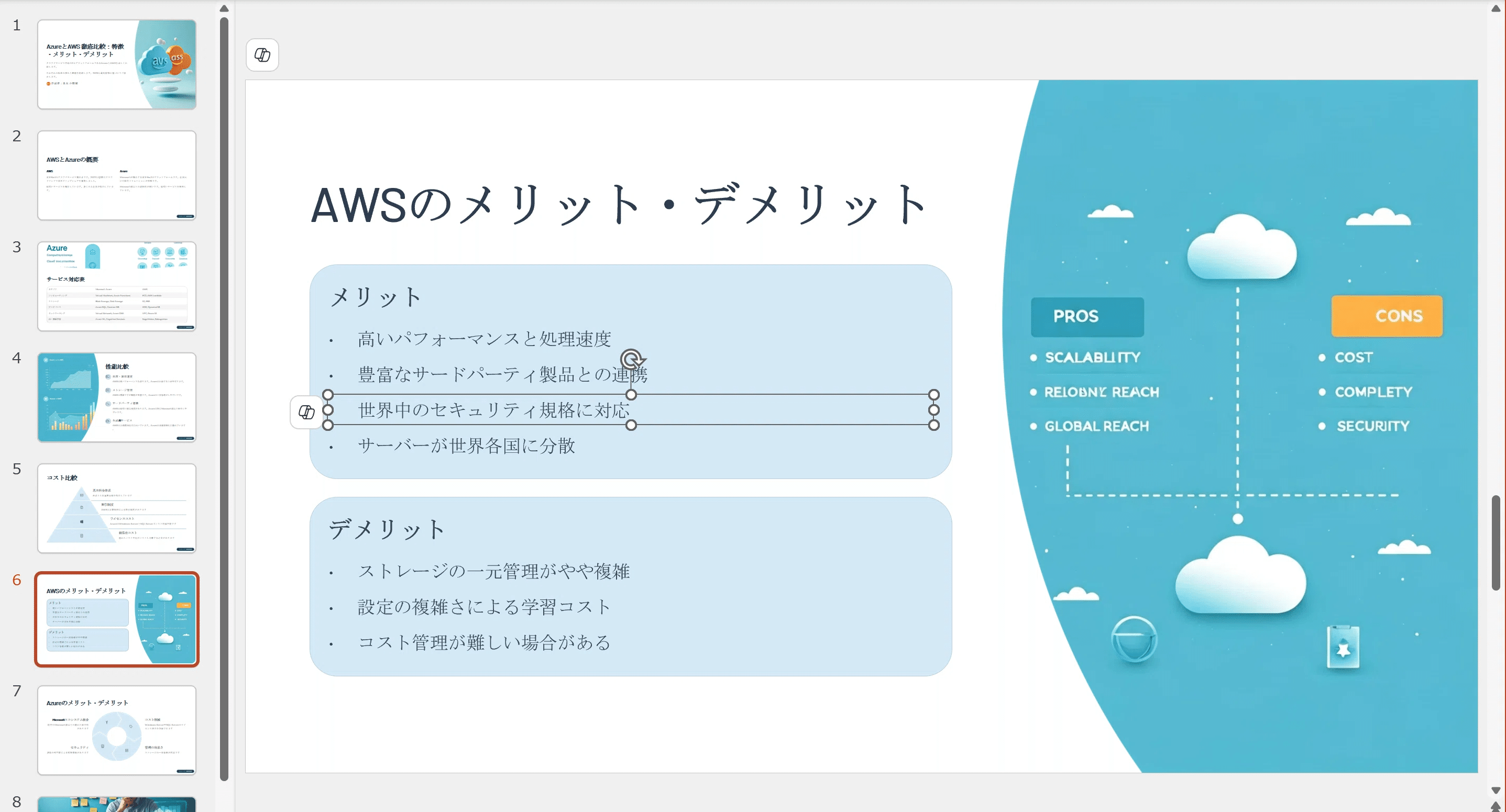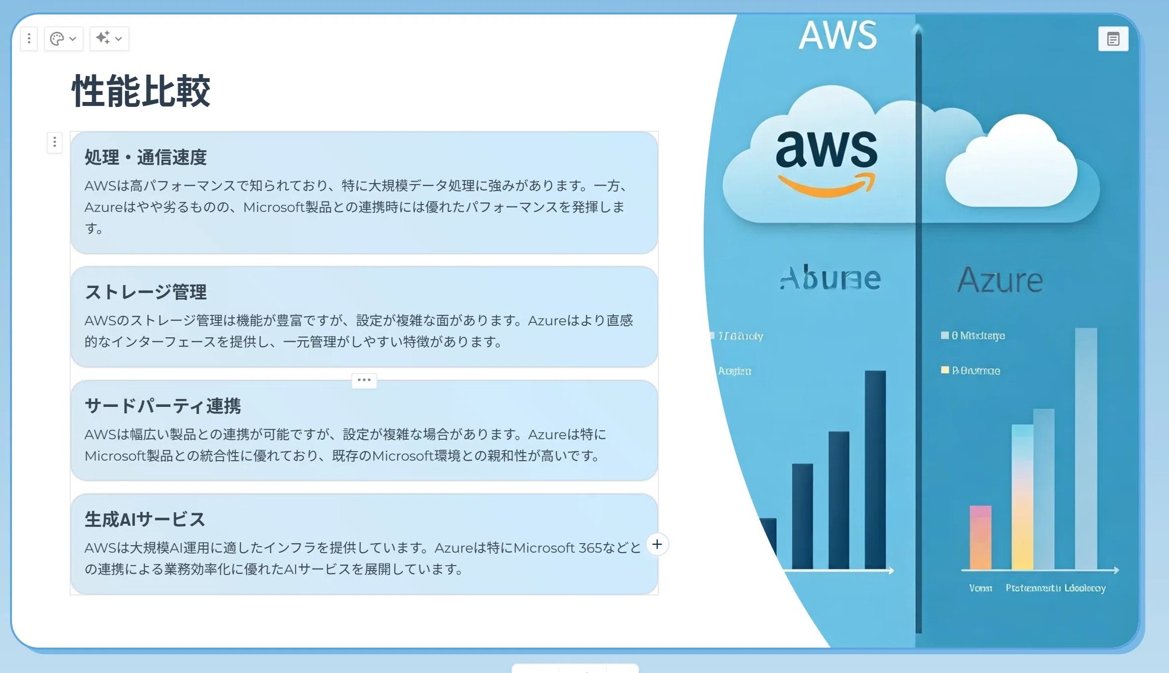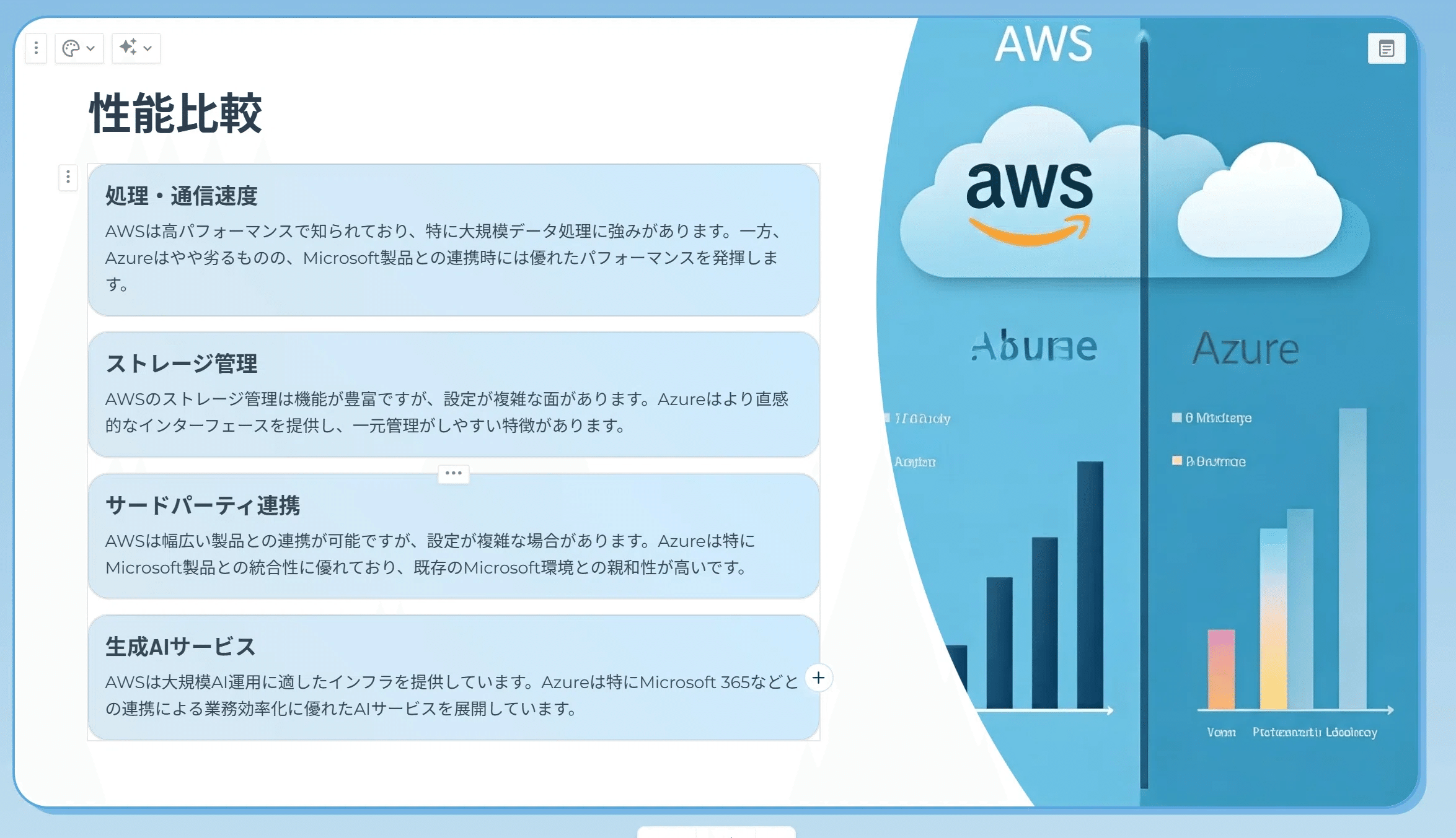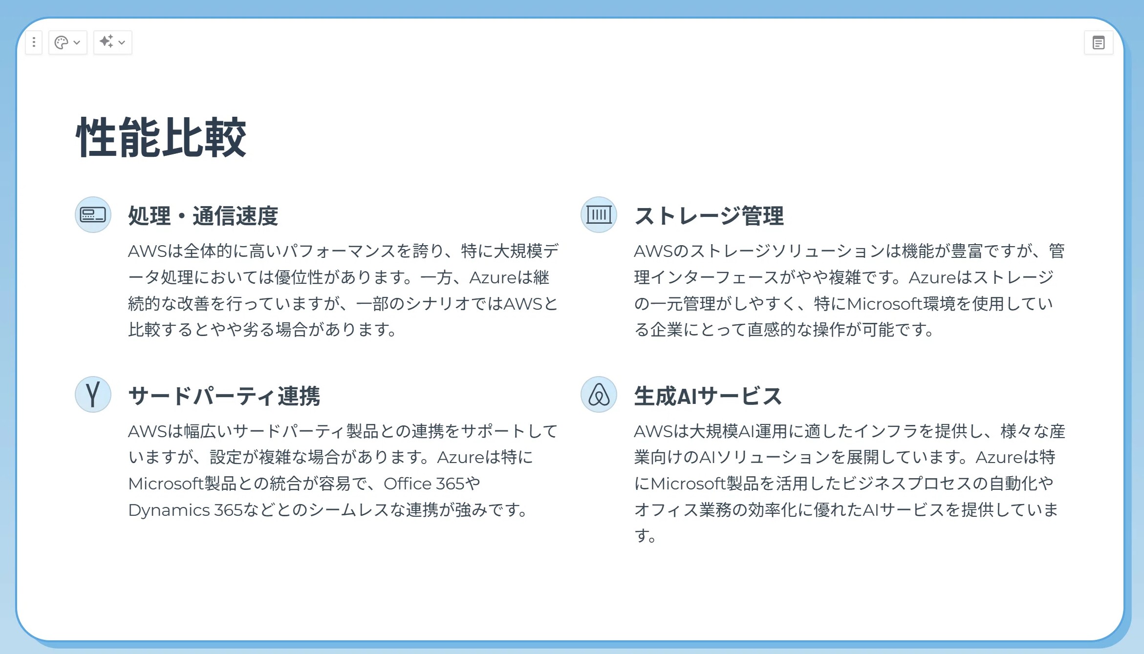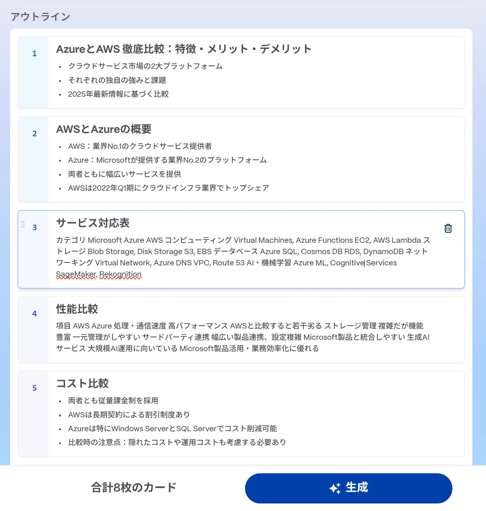 では、改めて本題に戻って先ほどのAWSとAzureの違いで依頼すると以下のようなアウトラインが出力されます。