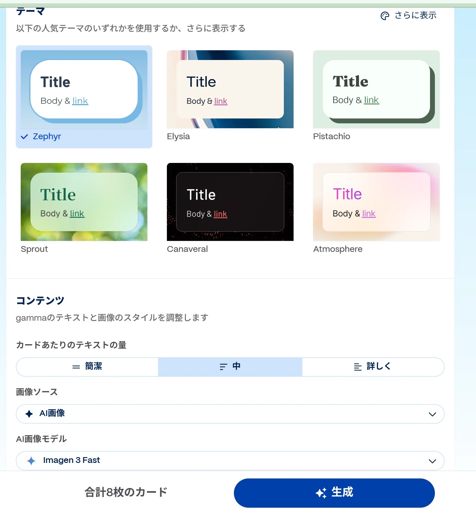 更に下にスクロールすると「テーマ」の設定やテキストの量、画像の使用有無を指定できます。最初は以下の内容のまま、全てデフォルトで行きたいと思います。