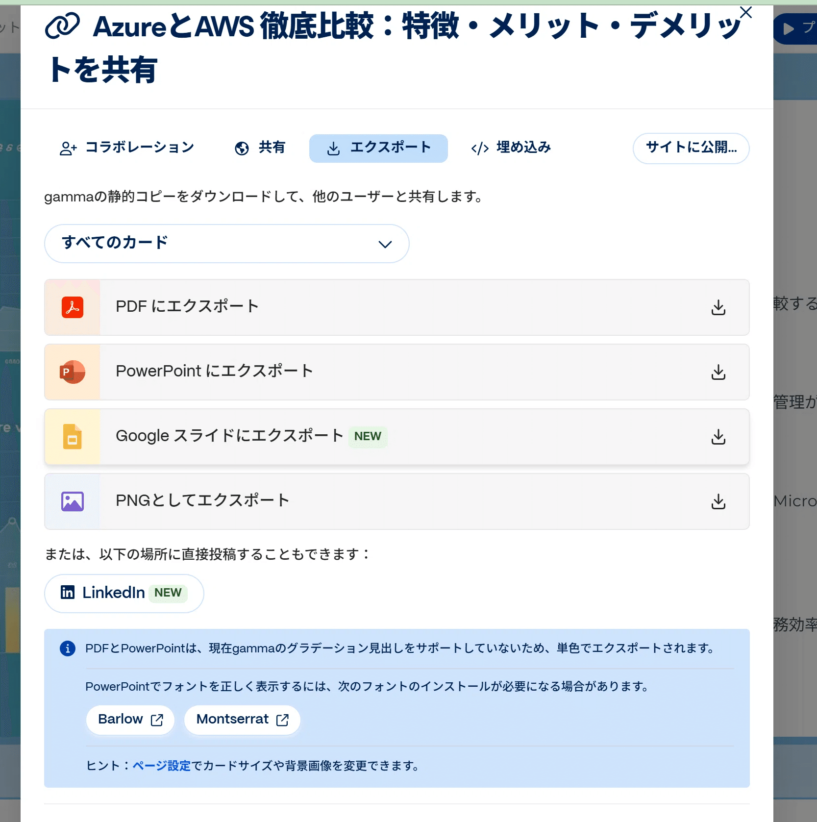 さて、メニューからエクスポートを選択すると以下の画面が表示されまして、パワーポイントはもちろん、PDFやGoogleスライド、PNGへのエクスポートが可能です。