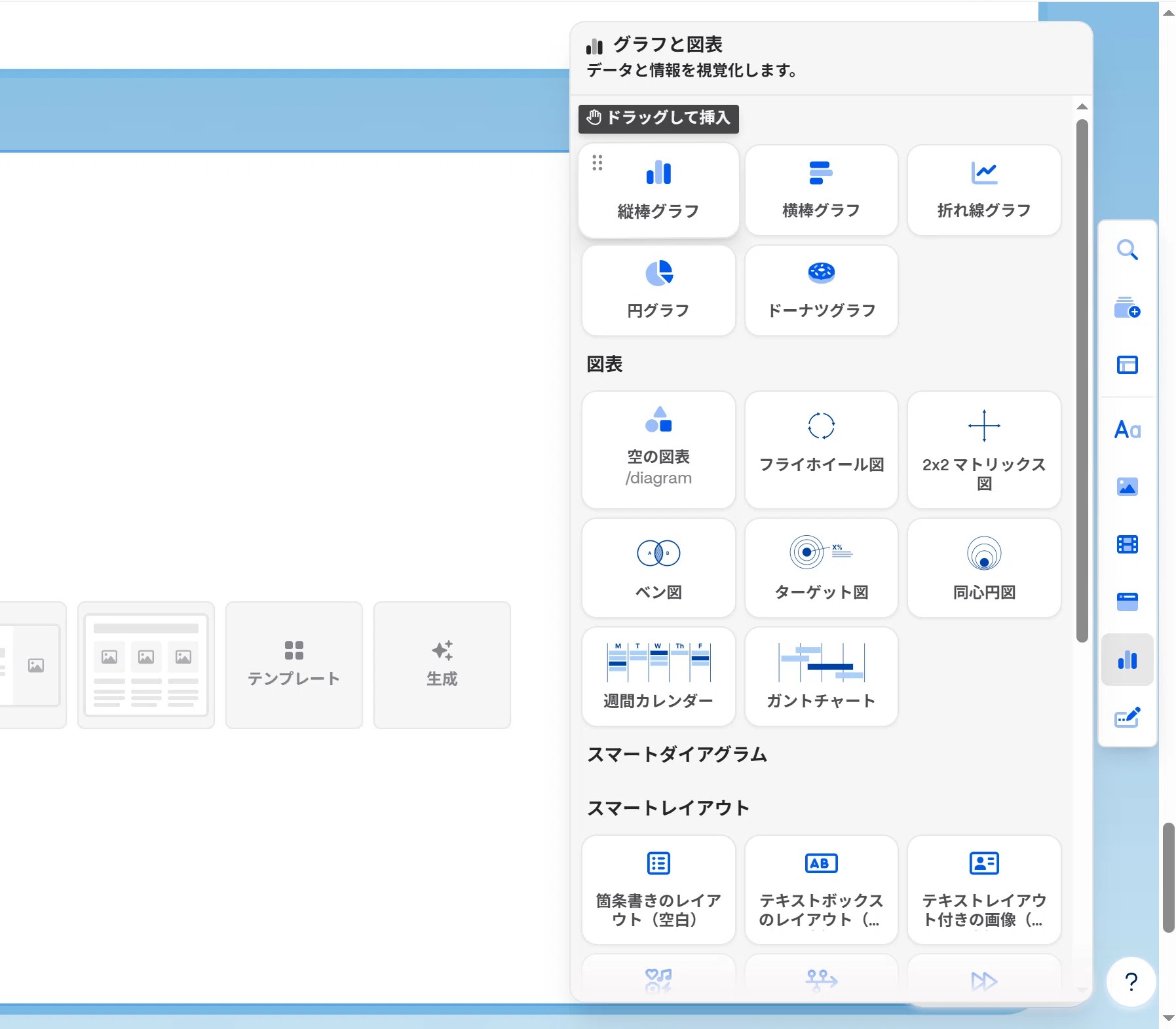 グラフや図表の挿入も当然ながら可能です。例えば以下のように「縦棒グラフ」を選択すると