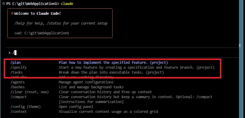 その時に使えるコマンドが表示されるのですが、以下の赤枠部分にあるコマンド、/plan、/specify、/tasks等が表示されていないとSpec Kitは使える状態にありませんので、もう一度環境や設定を見直してみてください。