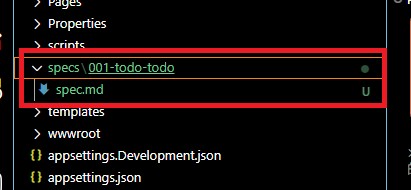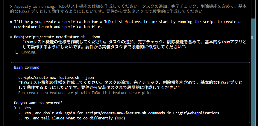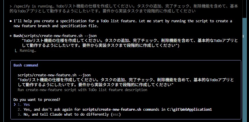 あらためて上記3つのコマンド(+実装のための「/Implement」コマンド)がSpec Kitのコマンドになりまして、仕様駆動開発ツールである以上、まずは仕様を作成するわけなのですが、そのためのコマンドが上に挙げた3つのうち、/specifyコマンドになります。