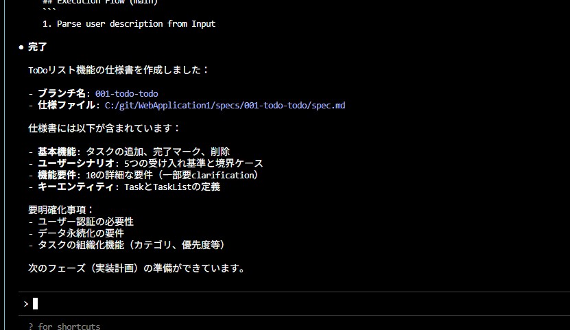 「/specify」に続けてどういった仕様を作ってもらうかを記述し、指示するわけですが、他のツールとの比較のために前回、前々回の記事に合わせてToDoアプリの作成を依頼します。