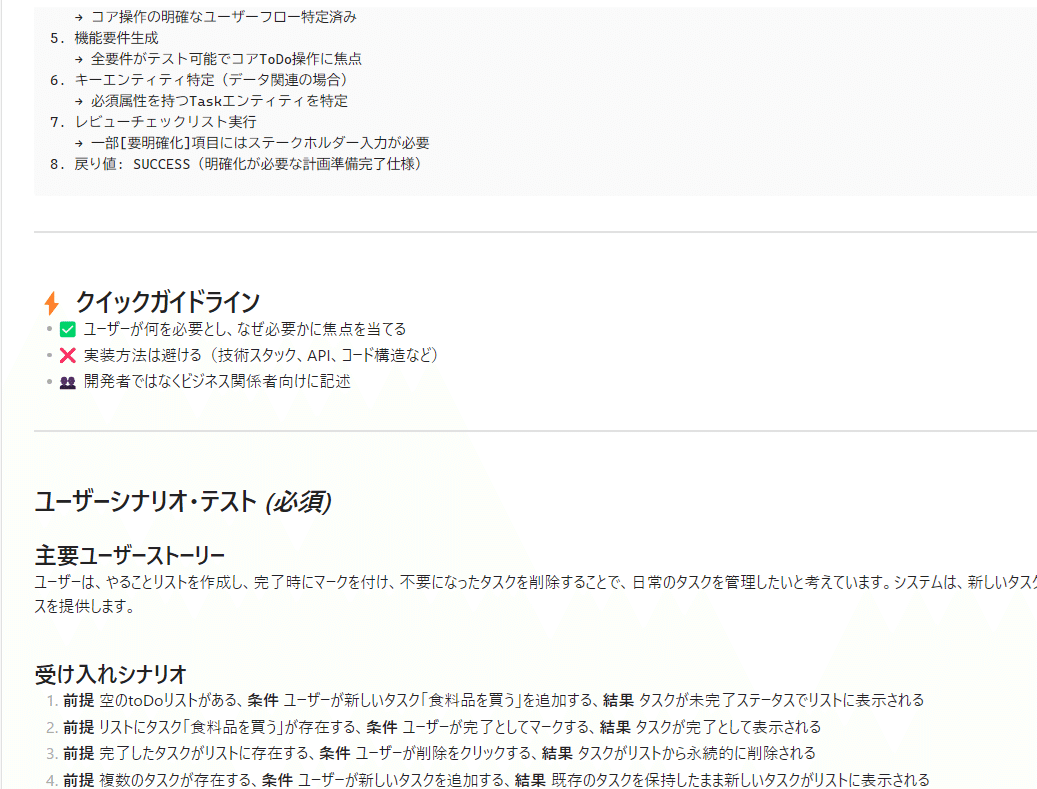 ちなみにspec.mdの内容は以下のようになりまして、クリックガイドラインやユーザーシナリオ等が記載されています。
