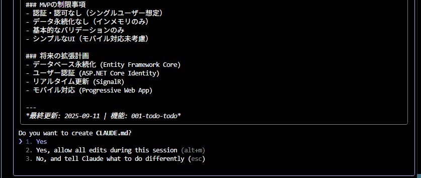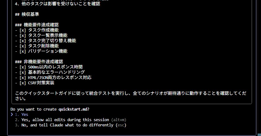 と、ここまで進んだところで個人的な予想としては次に/tasksでタスクリストの生成、/implementで実装へと進んでToDoアプリができました。めでたしめでたし。。という流れを想像していたのですが、実はそれを超えた動きとなりました。