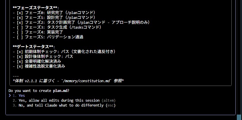 先ほどのspecsフォルダにplan.mdファイルが作成され、そこに実装計画が書き込まれます。