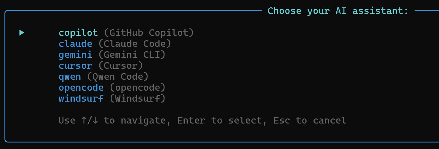 上記コマンドのうちいずれかを実行しますと以下のようにタイトルがかっこよく表示され、AI アシスタントを選択するように促されます。