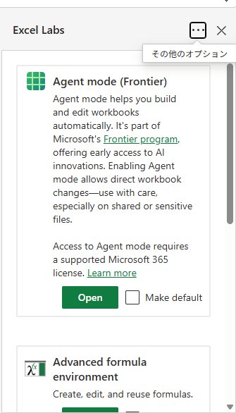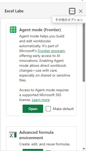 ということでWeb版Excelを開き、再度「Excel Labs」のアイコンをクリックしますと以下のような表示になります。