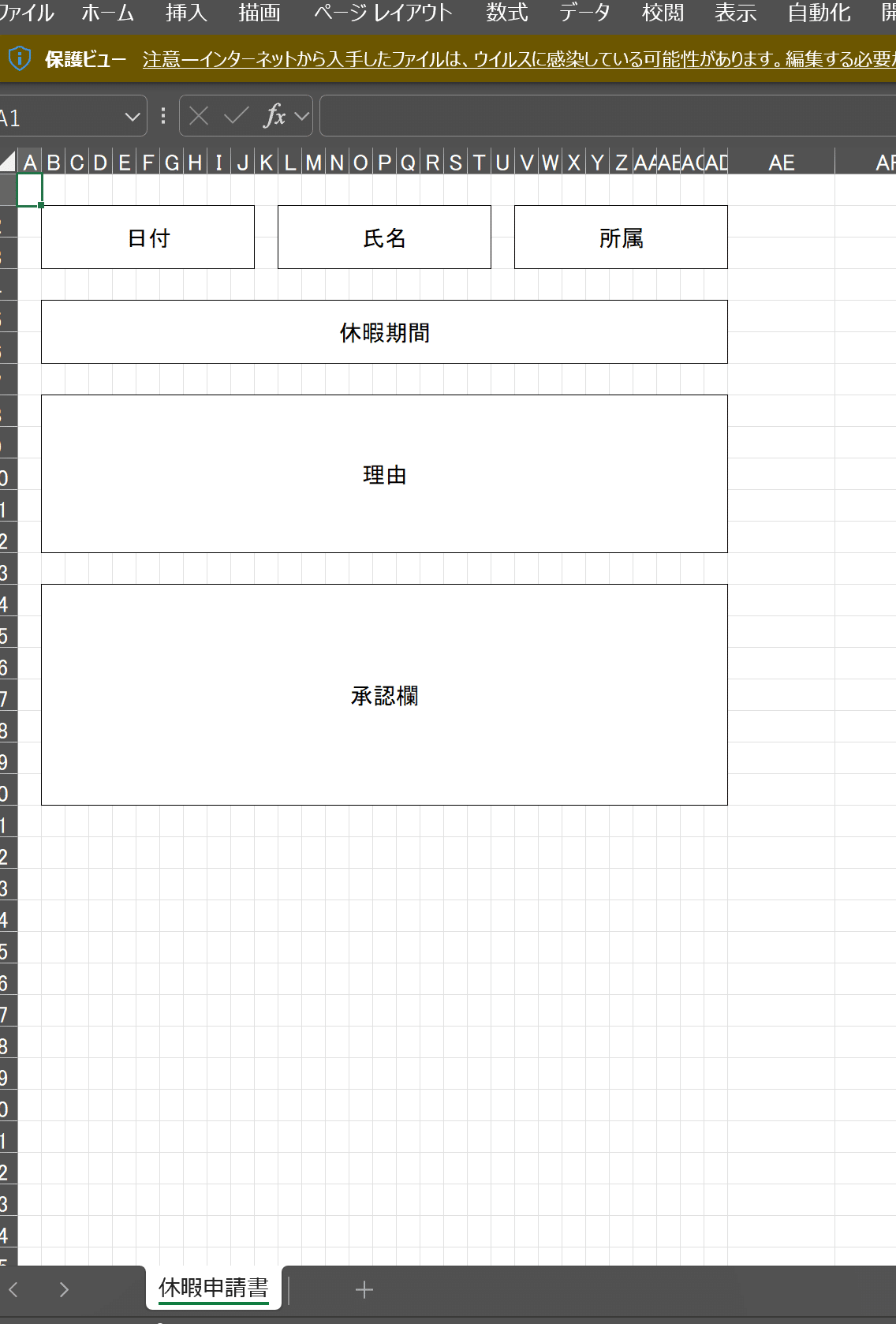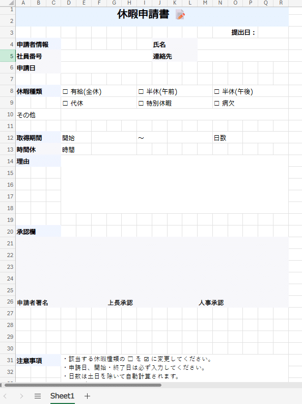 プロンプトで依頼してから数分待ちますと以下のような、そのまま会社の正式資料として使えそうな休暇申請書が作成されました(実際のExcel方眼はもっとマスが小さいと思いますが、まあこんなものでしょう。。)