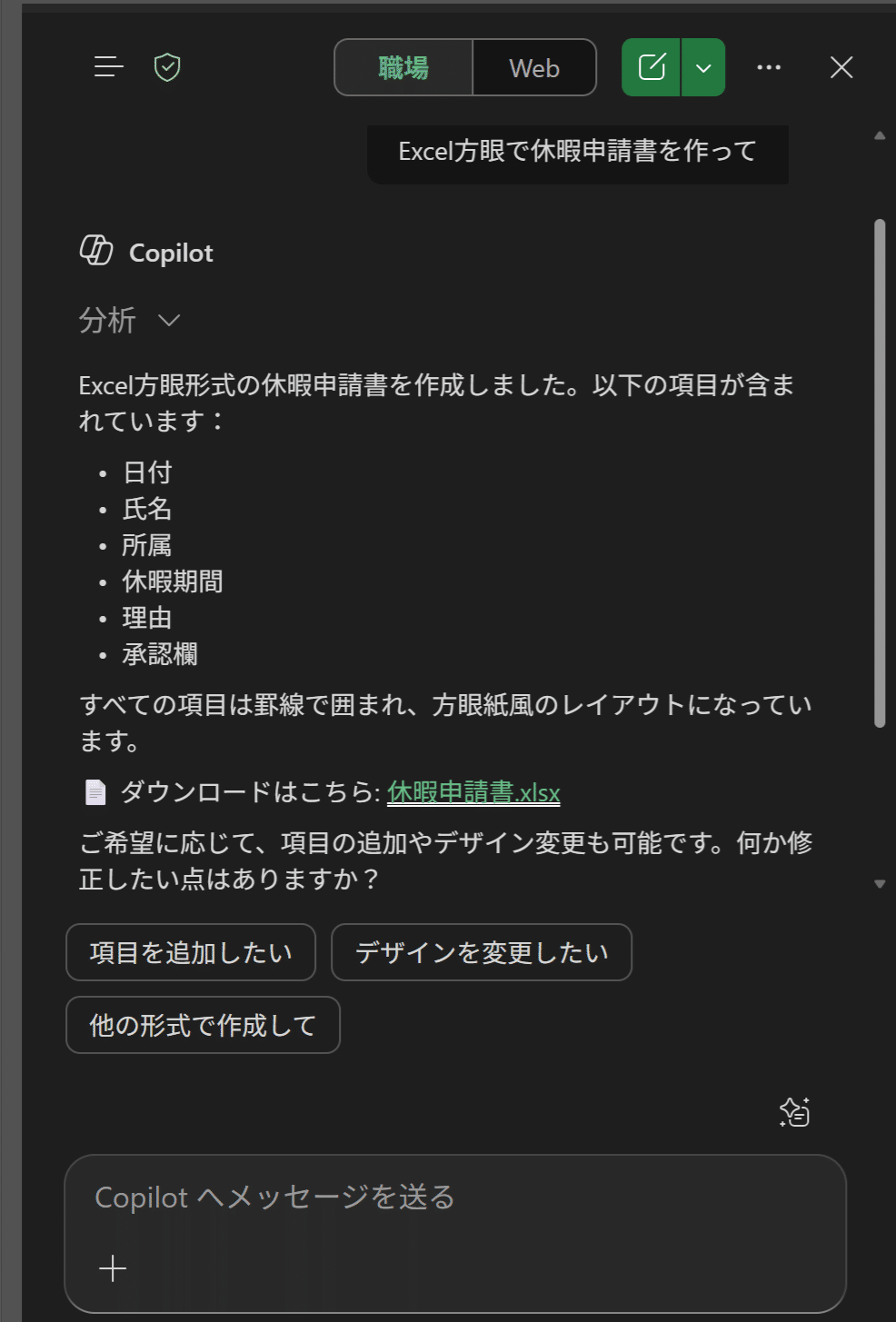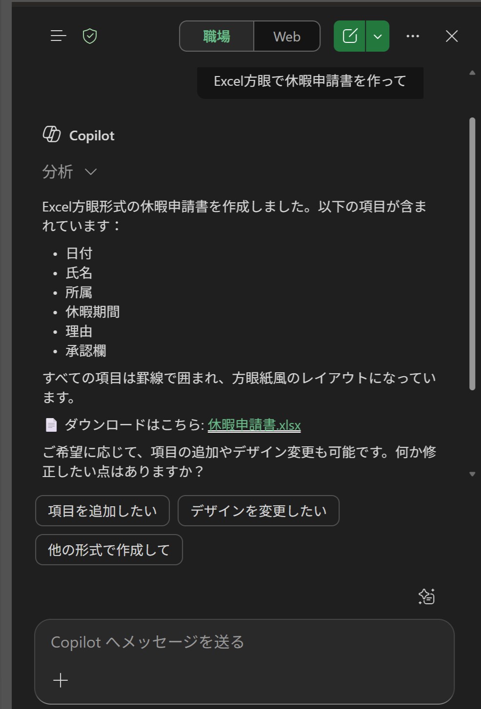 まずは「Excel方眼で休暇申請書を作って」とお願いしてみます。