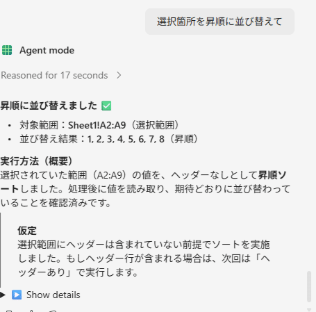 とはいえ、皆さんもExcelを触っていると「これってどうやるんだっけ?」「こういう風にできないだろうか」といったようにExcelの使い方に関してちょっとした疑問が出てくると思うのですが、これもWebで調べたり、もしくはClaudeやChatGPT等の他のツールで調べることなく、Agent modeで自然言語でのやり取りにより対応してくれるわけです。