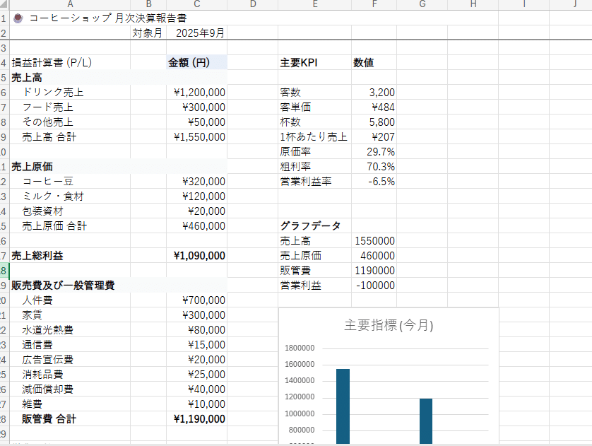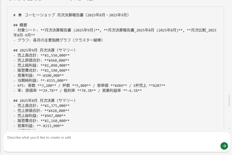 プロンプトは「コーヒーショップの月次決算報告書を作成して」だけです。