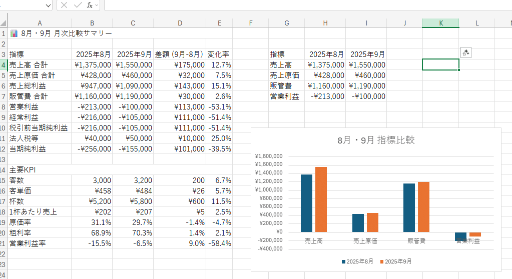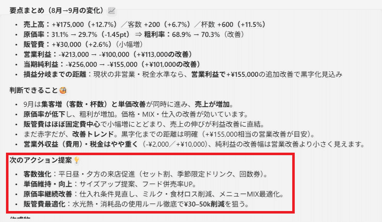 これだけでもすごいのですが、上記が9月分ですので8月分のも作成してもらい、更に「8月と9月の決算内容から判断できることはなんでしょうか。」と投げてみます。