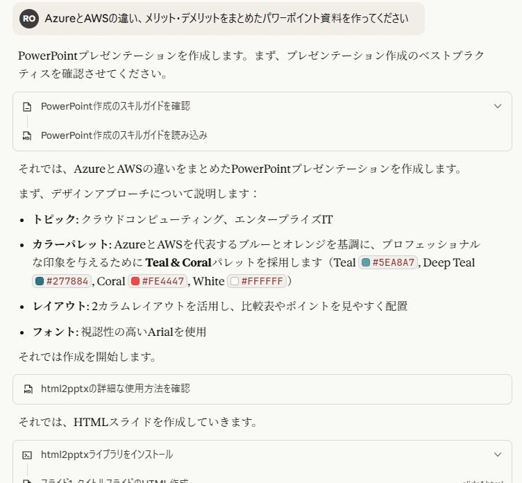ただ(ここからは個人的な感想になりますが)、対話形式でExcelを作成でき、その完成度の高さという意味ではやはり本家Agent modeには及ばないかなと思います。まだ発表されていないようですが、このAgent modeがPowerPointでも使えるようになった場合、かつ、WordやExcelの場合と同等のレベルで使えるのであれば、やはりPowerPointにおいてもAgent modeの独壇場になりそうな気がしておりまして、元々のClaudeの機能と話がずれてしまいますが、そちらが非常に気になっているところです。