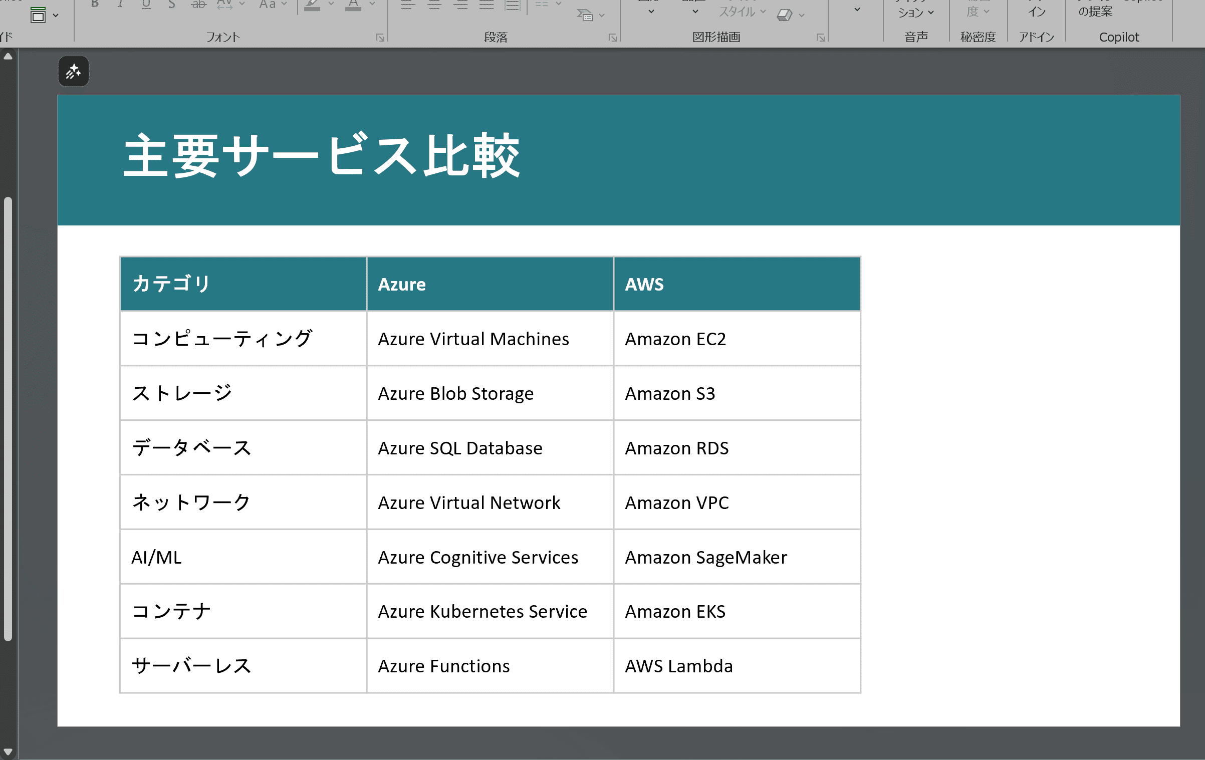 Claudeによる資料は見た目は落ち着いているものの、内容としては色々と考えられており、上で挙げたページには存在していないですが、AzureとAWSとで色分けをしていたり、コンテンツとしてはこちらの方がちゃんと作られている印象があります。