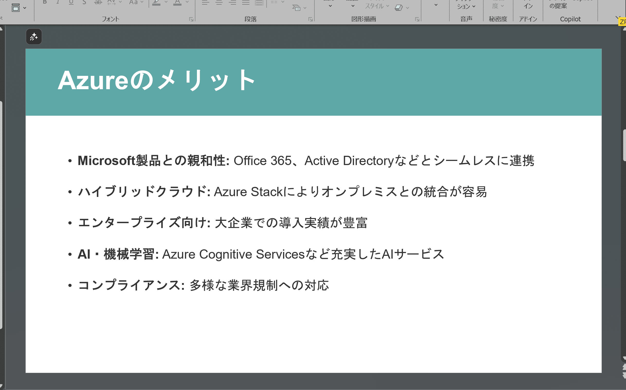 「AzureとAWSの違い、メリット・デメリットをまとめたパワーポイント資料を作ってください」