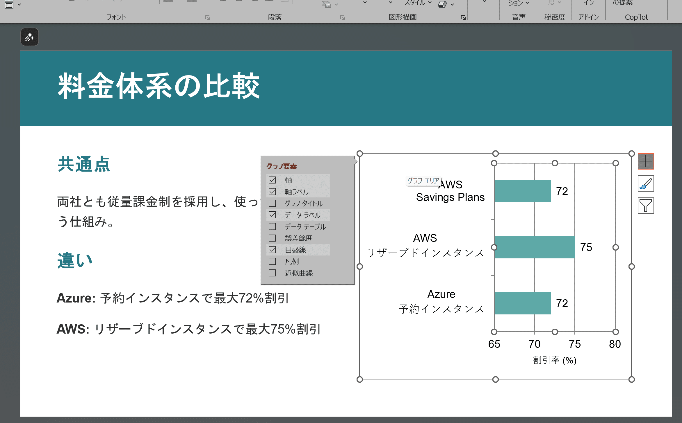 Copilotとの違いは表もちゃんと作られているところでしょうか。あとはグラフも作られており、しかもPowerPointから設定が可能です。この点は「おっ」と思わされました。