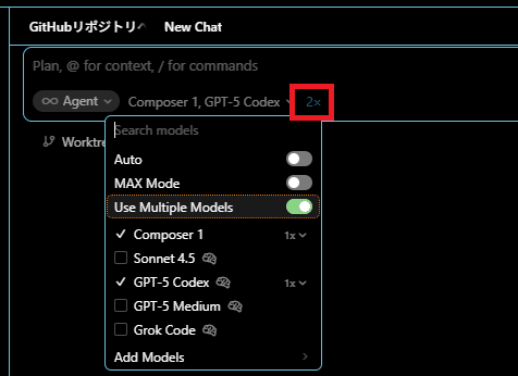 マルチエージェントで複数モデルを実行できますので、Composerの速度を他のモデルと比較してみたいと思います。