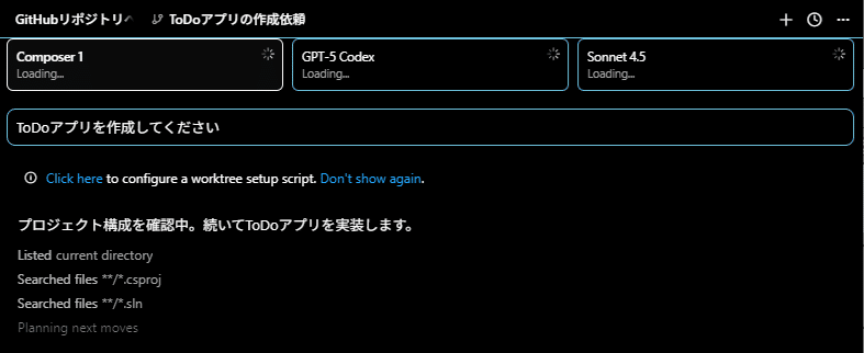 結果としてComposerはやはり速く、1分もかからずに作業が完了しました。次にSonnet4.5が2~3分で、最後にCodexとなりました。順位自体はなんとなく予想はしていましたが、確かにComposerは早いです。
