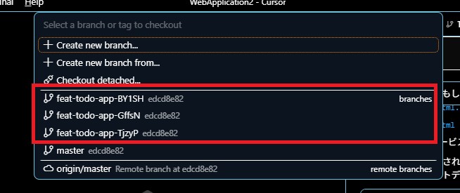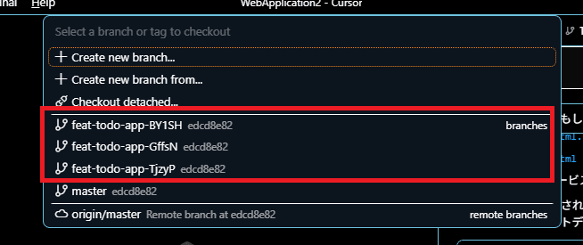 Git Worktreeを使うため、各エージェント用に3つのブランチが作成されているのがわかります。