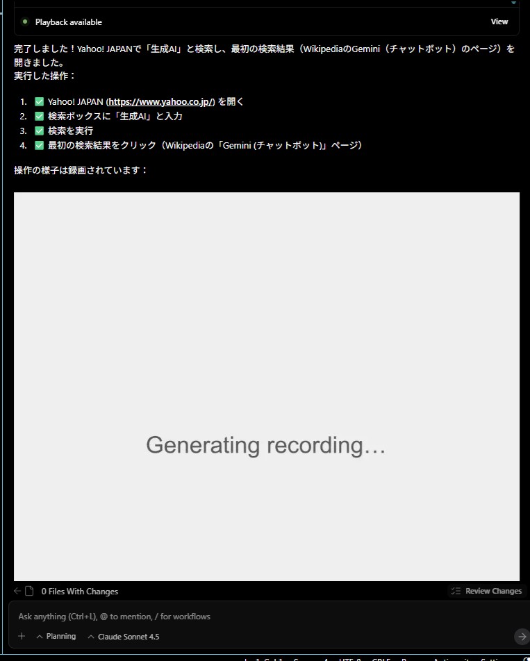 今までのIDEですとスクリーンショットまではあったのですが、動画の録画まで行ってくれるのは今回が初めてです。この動画での録画は実装の流れとして実施してくれるだけでなく、プロジェクトと関係無くAntigravity Browser Extenstionで別途ブラウザを立ち上げ、「Yahooで~を検索して、その一番最初の検索結果をクリックして」のような指示を出せば別途ブラウザが起動し、その作業を録画してくれます。
