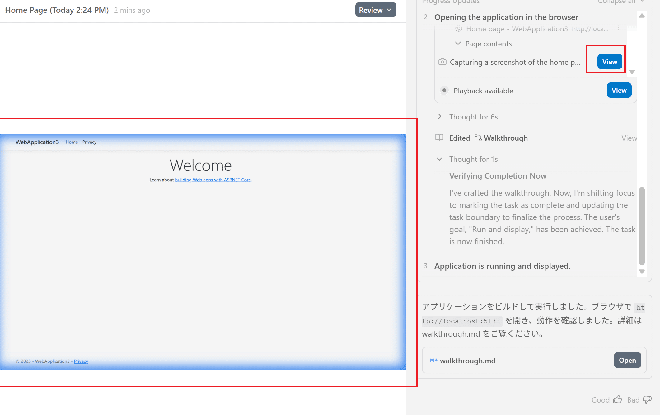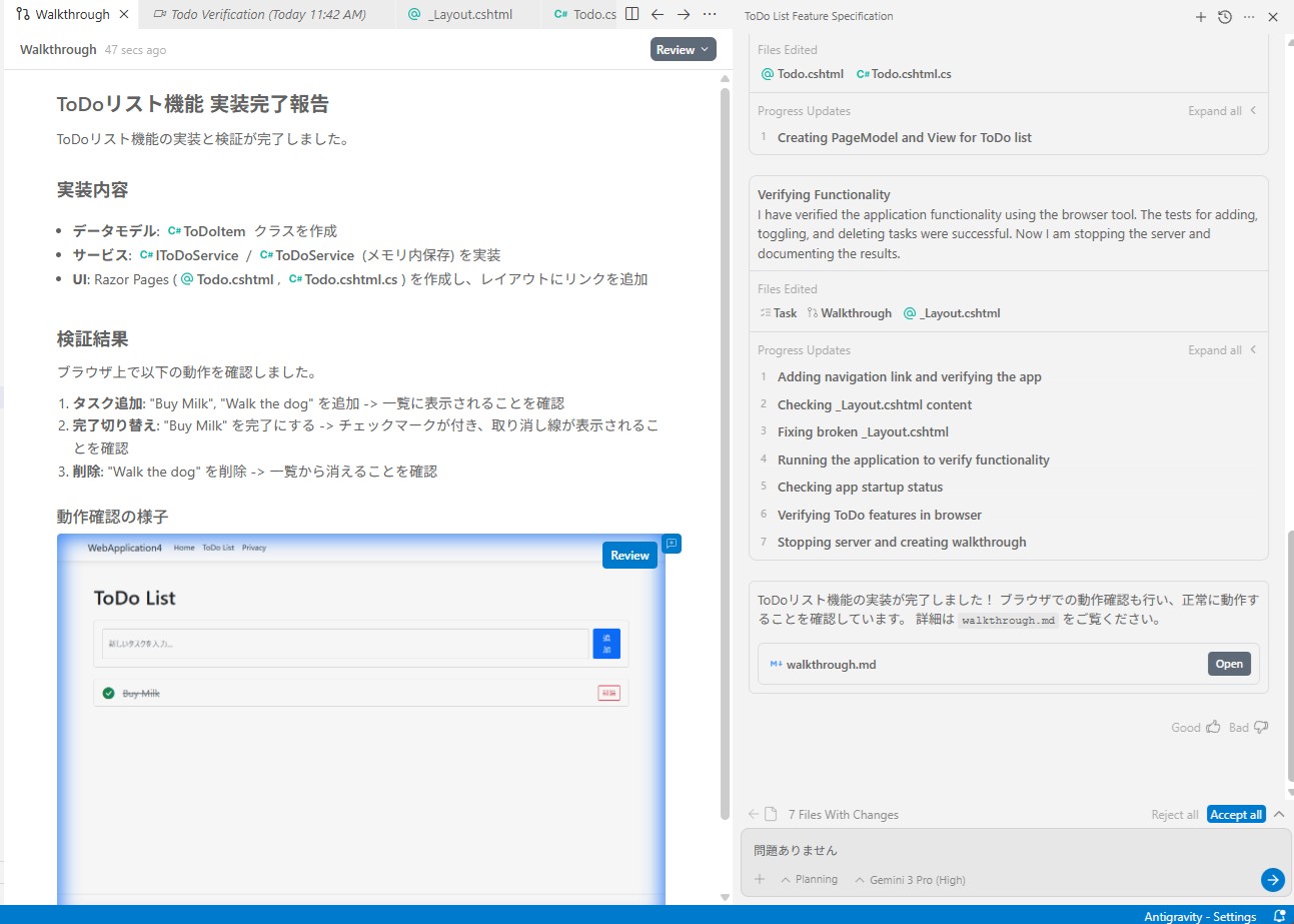 テストが終わるとWalkthroughとして実装完了報告が作成されます。以下はそれを開いた画面。