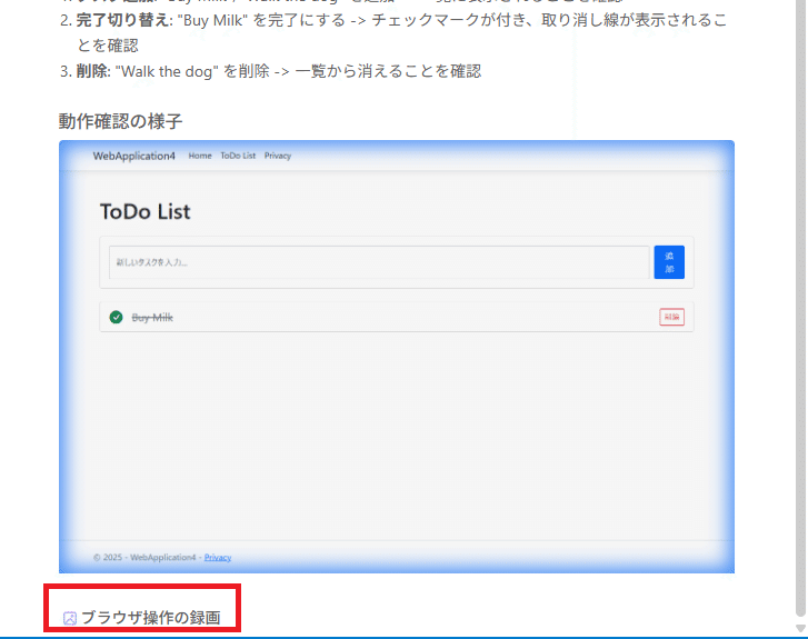 実装完了報告書の下にスクリーンショットが見えると思いますが、更にその下にある「ブラウザ操作の録画」をクリックします。