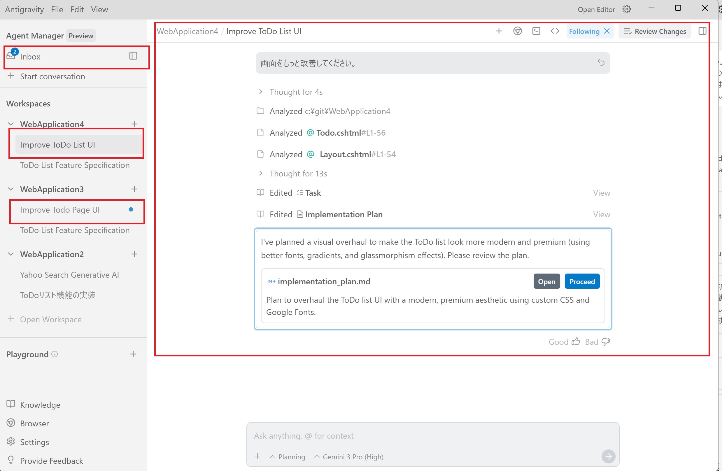 コードは表示されないですが、ここで各プロジェクトに対して指示が出せます。上の画面では少々分かりにくいのですが、「WebApplication3」と「WebApplication4」というプロジェクトに対して同時にUIの改善を指示しています。