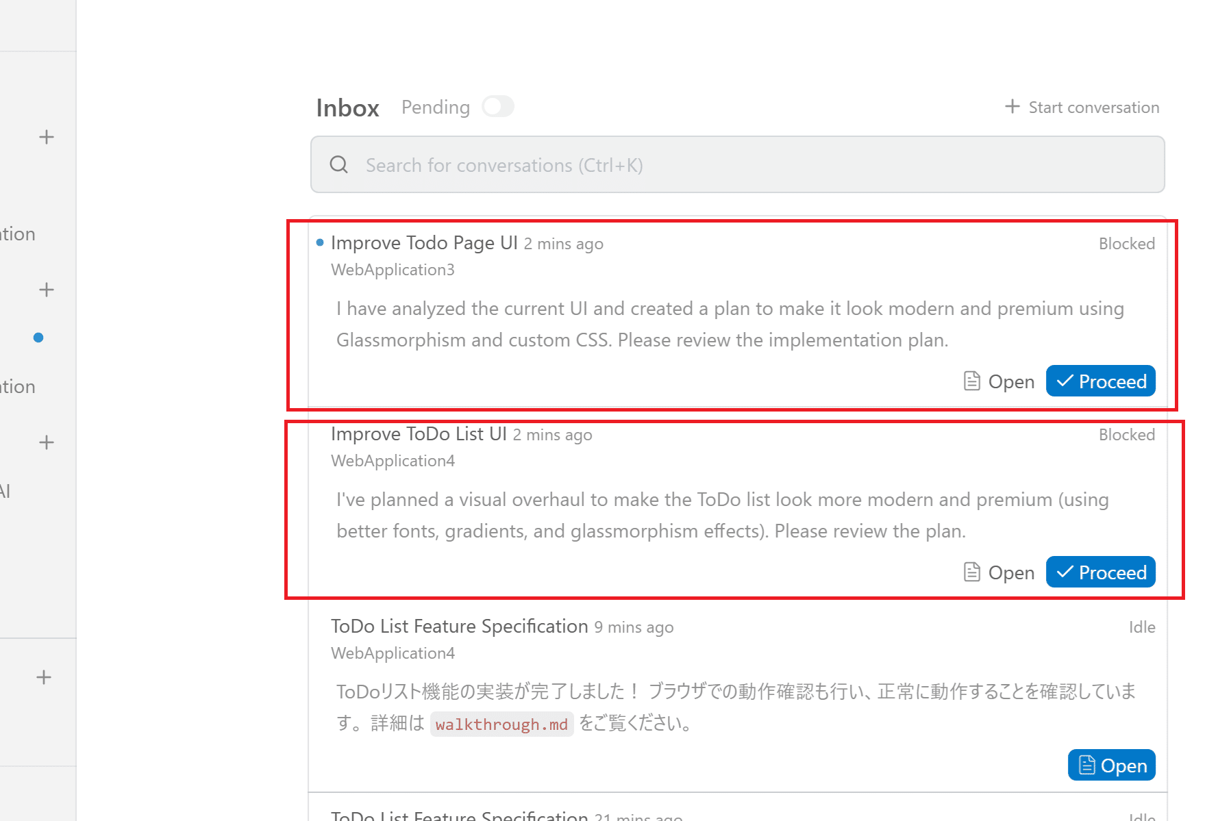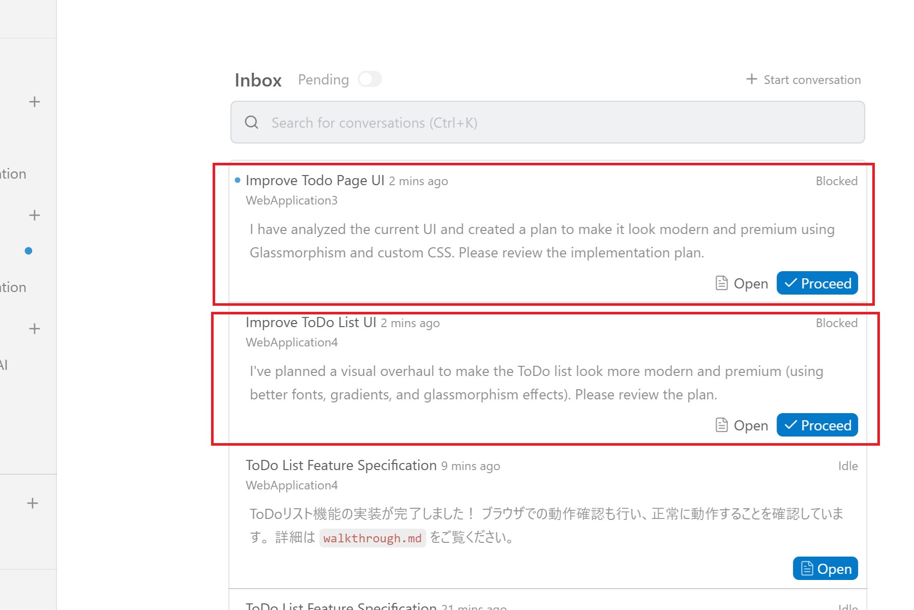 右側の一番上「Inbox」をクリックすると以下のような画面になり、各プロジェクト、エージェントの状況が把握でき、必要に応じて承認を行うこともできます。文字通りエージェントの管理が行えるわけです。